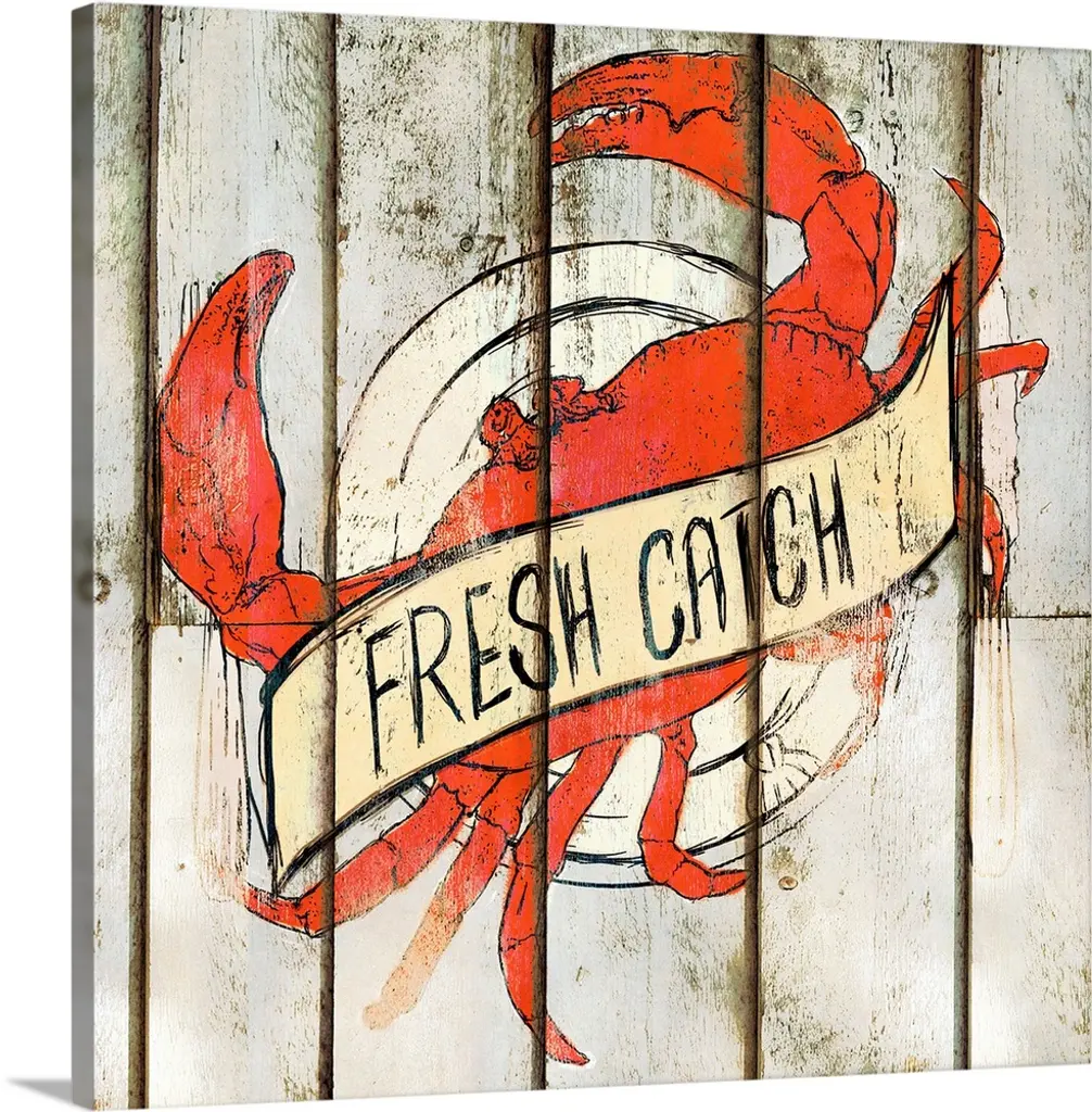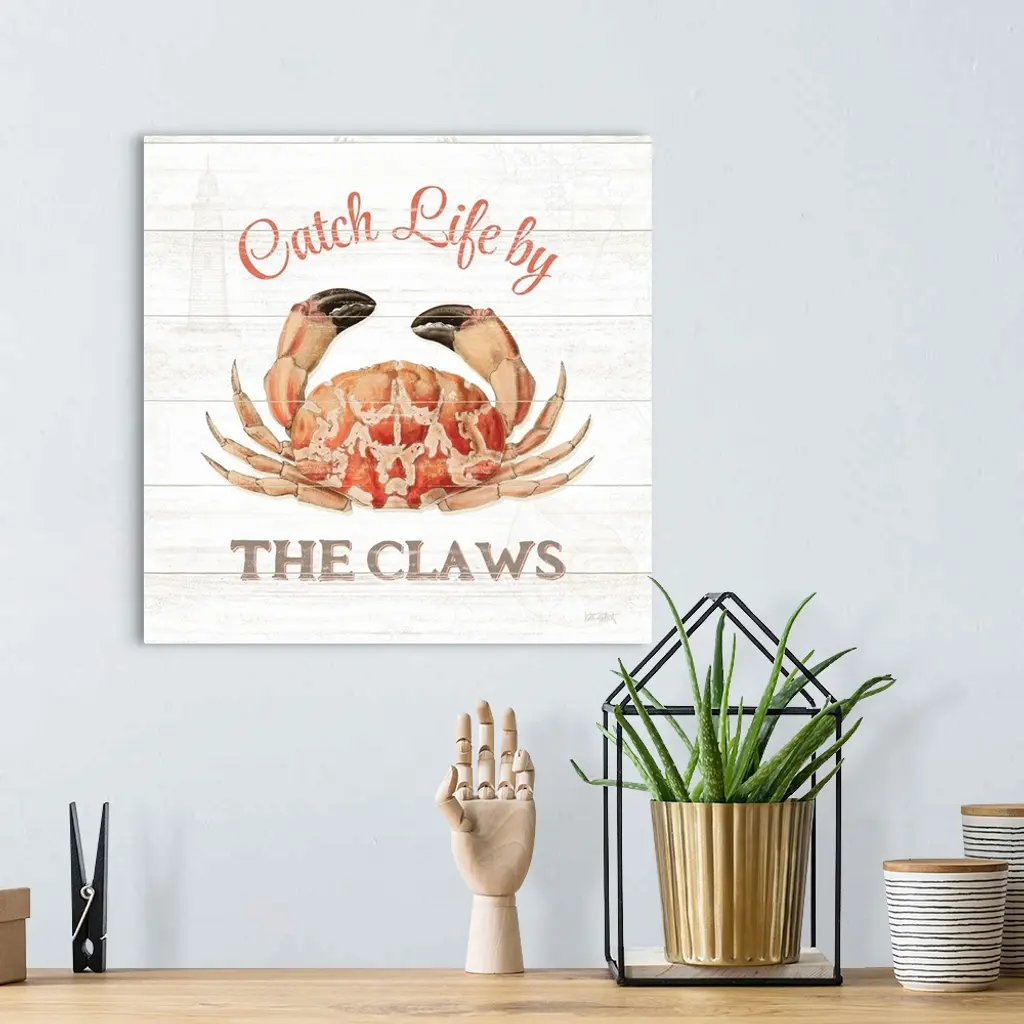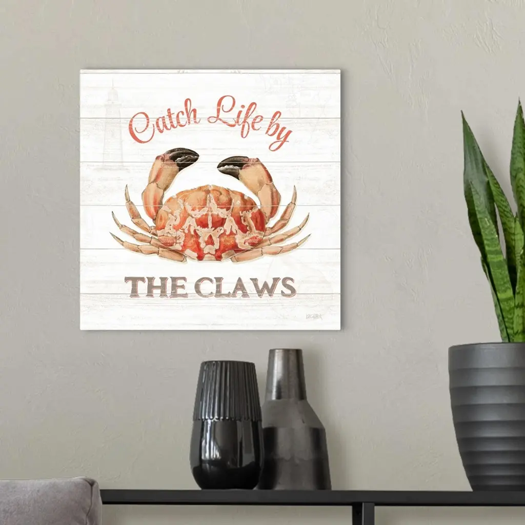 Square beach decor with "Catch Life by The Claws" written around an illustration of a crab, on a white wooden background.