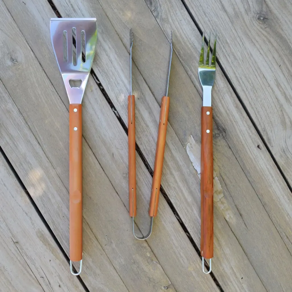 Three piece stainless steel barbecue tool set with wood handles and a convenient 600D polycanvas storage case. Nice size tools to take along when camping or grilling on the road. Lifetime Warranty.