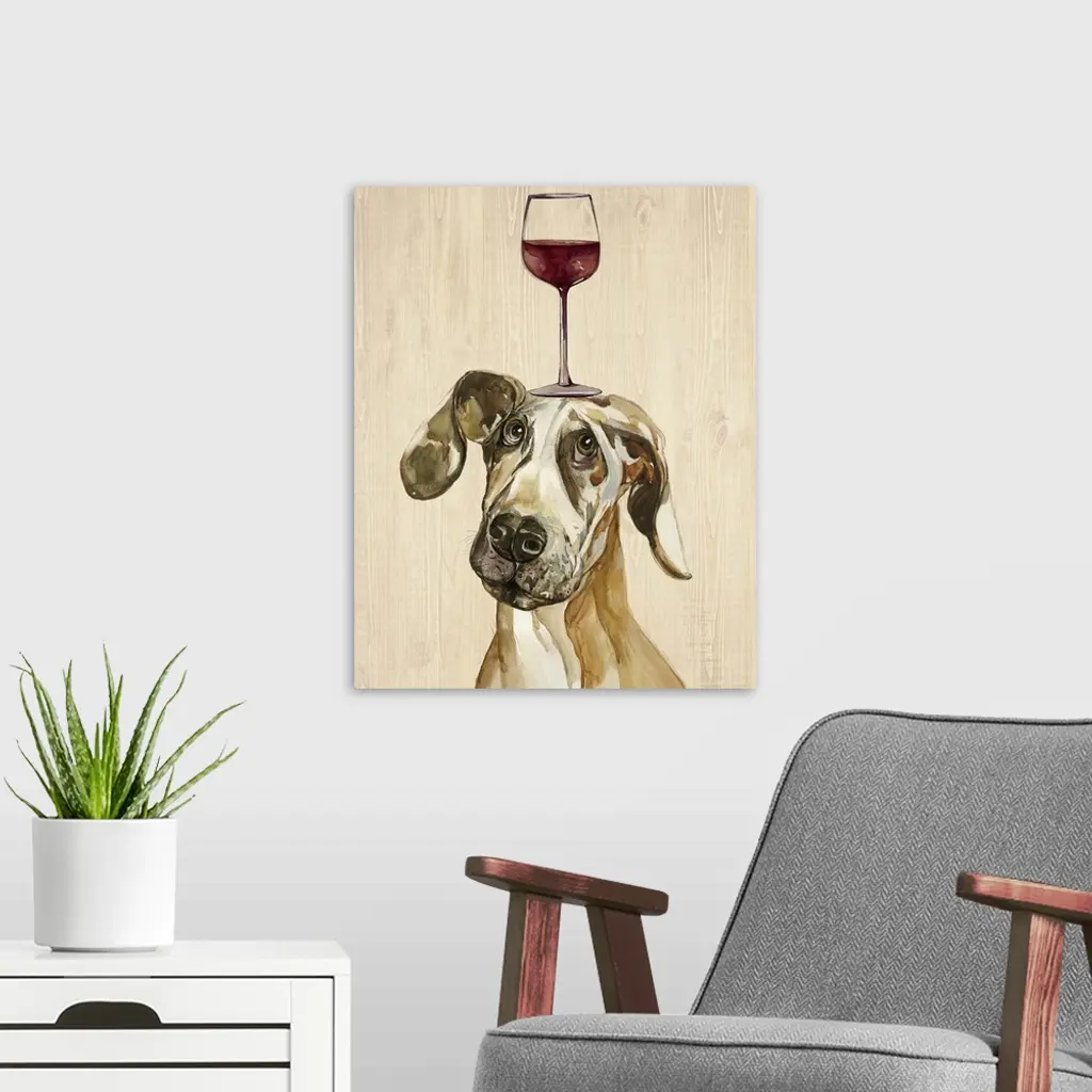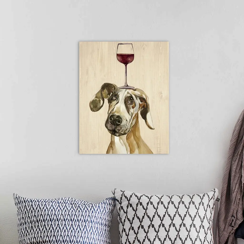 A Great Dane balancing a glass of wine on its head.