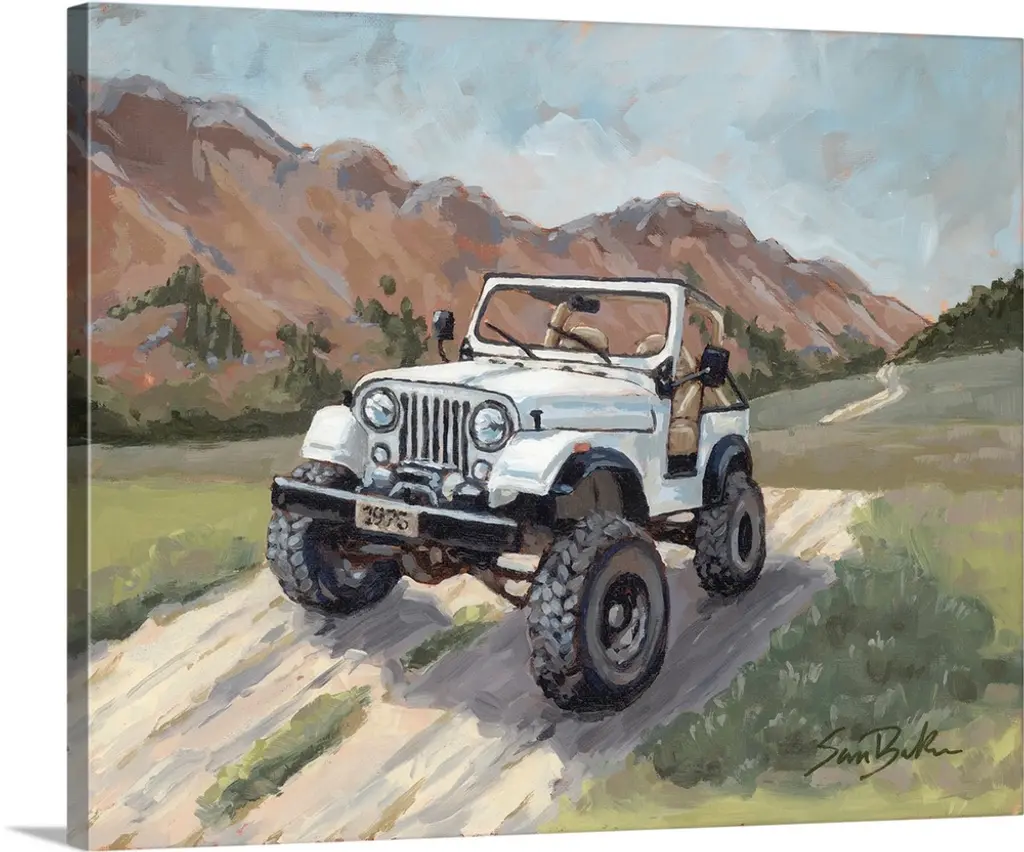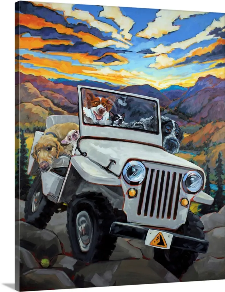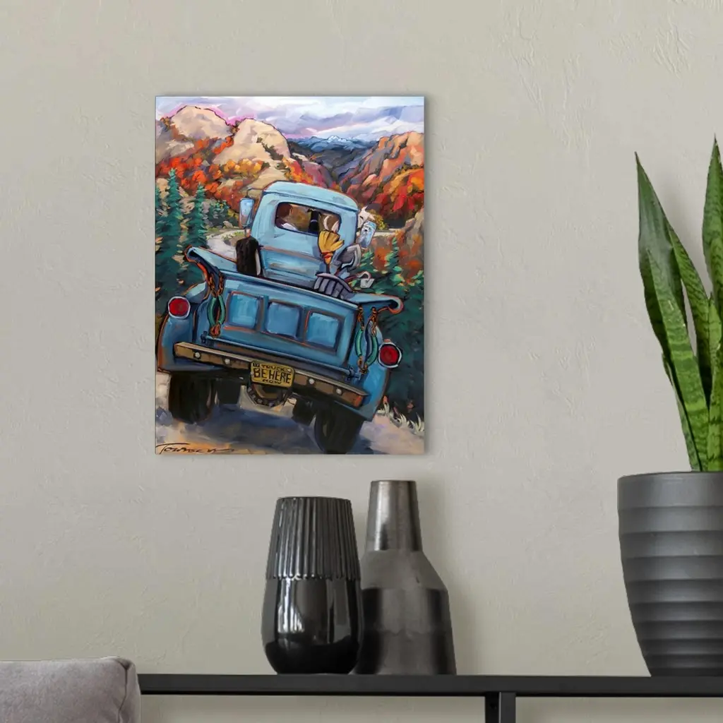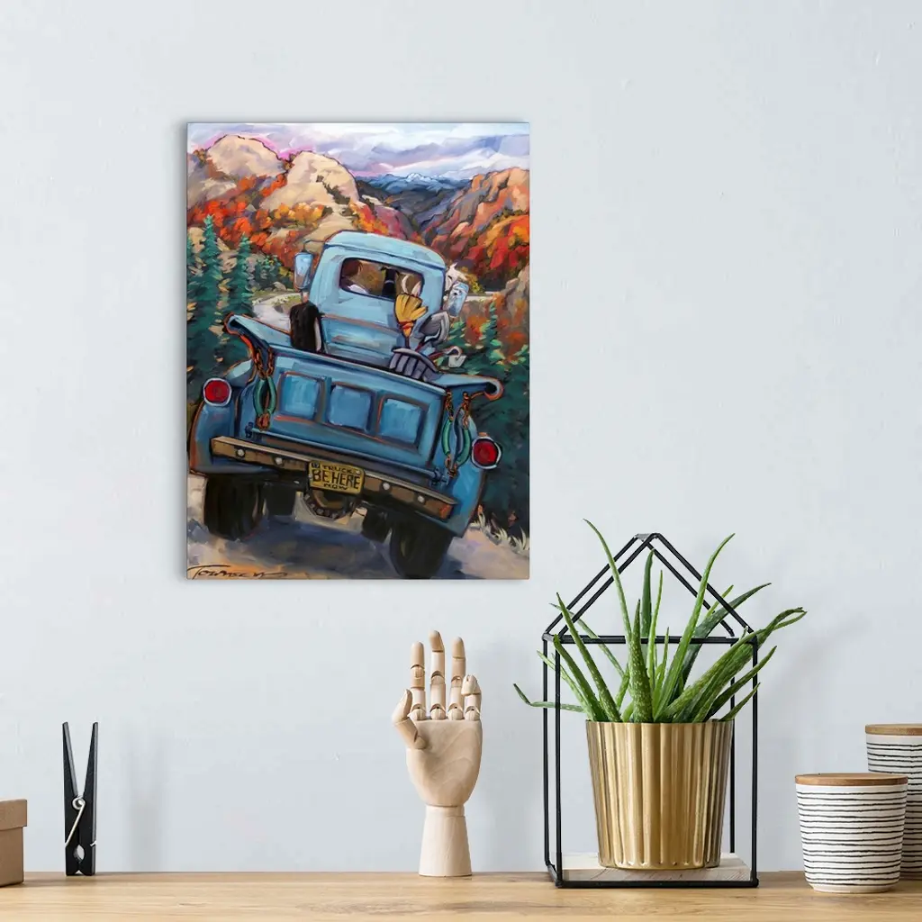 Thick brush strokes create a humorous scene of a dogs riding in a truck on a country road.