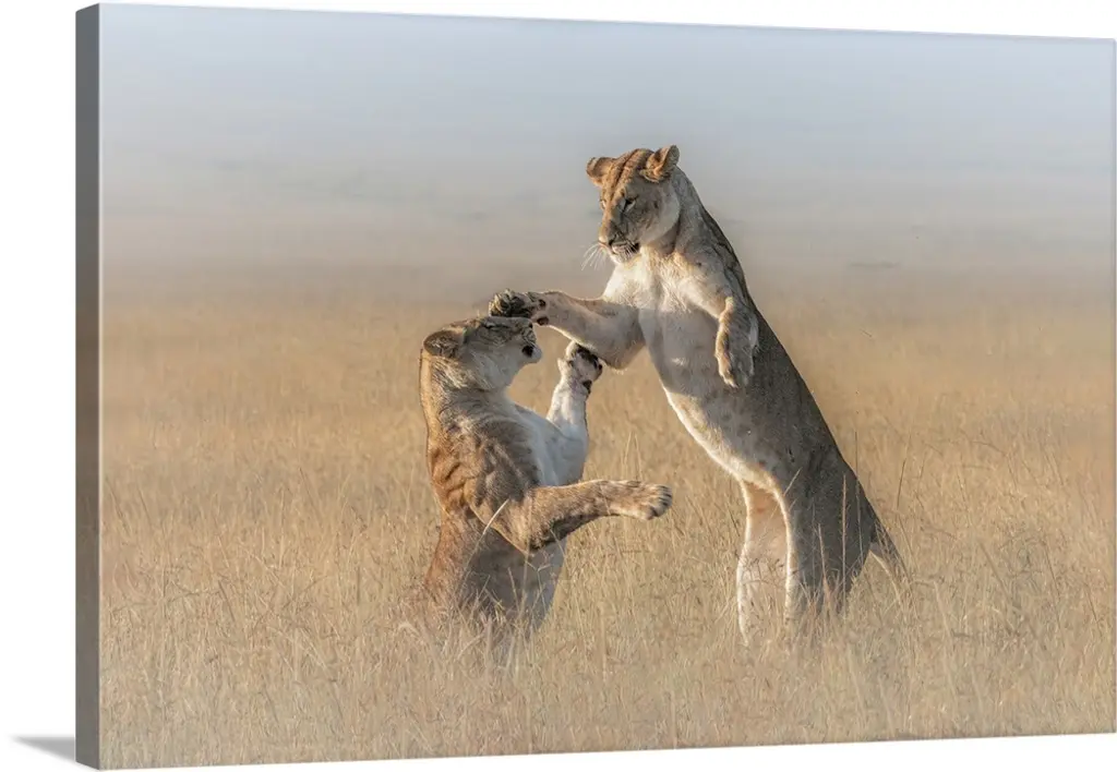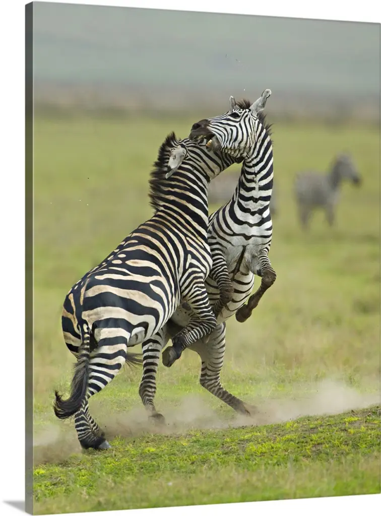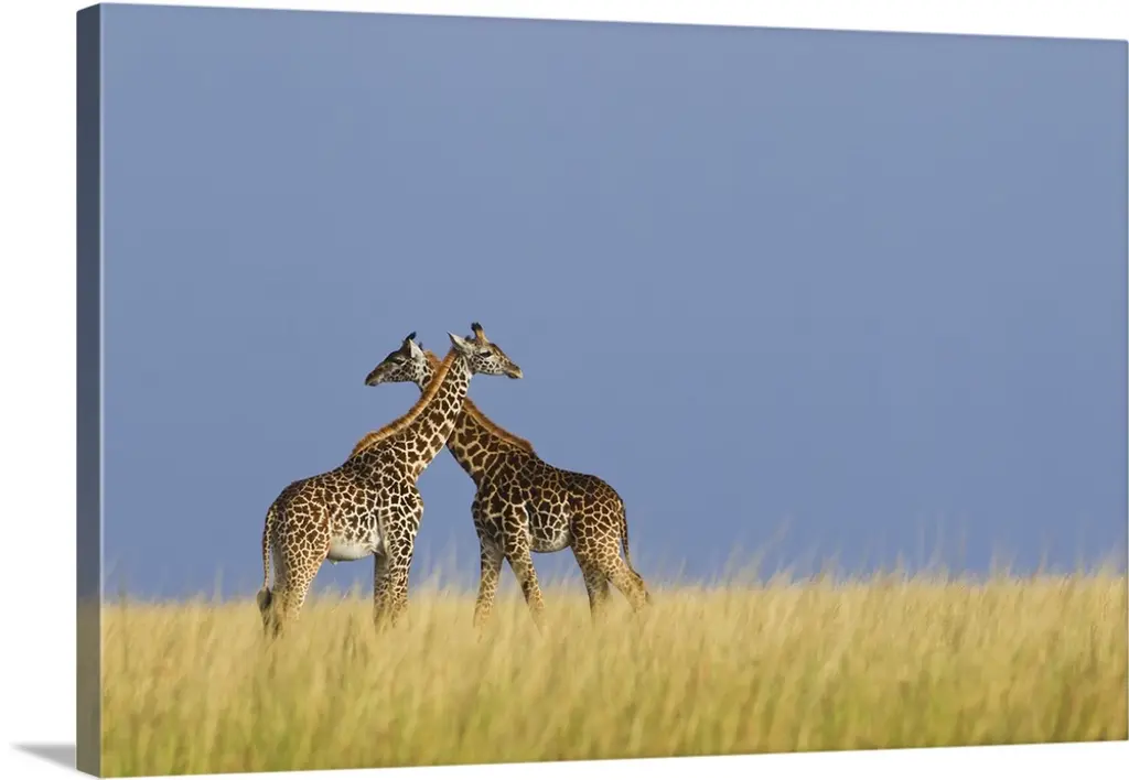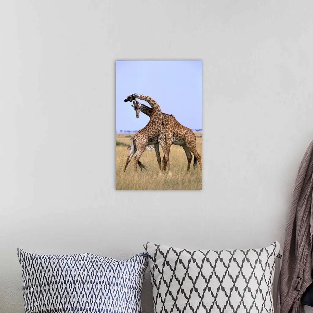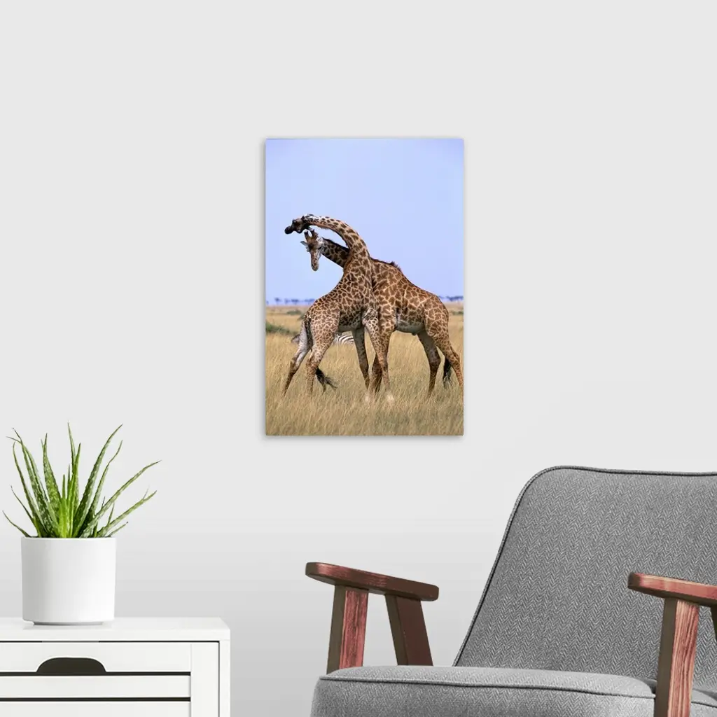 In Kenya's Maasai Mara National Reserve, two male giraffes engage in a thirty-minute sparring match, delivering solid thumps to one another with powerful necks and bony heads.