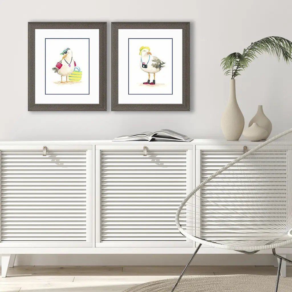 Hip birdies head to the beach. This colorful cast of characters is matted in white and framed in a rustic wood-grain finish moulding.