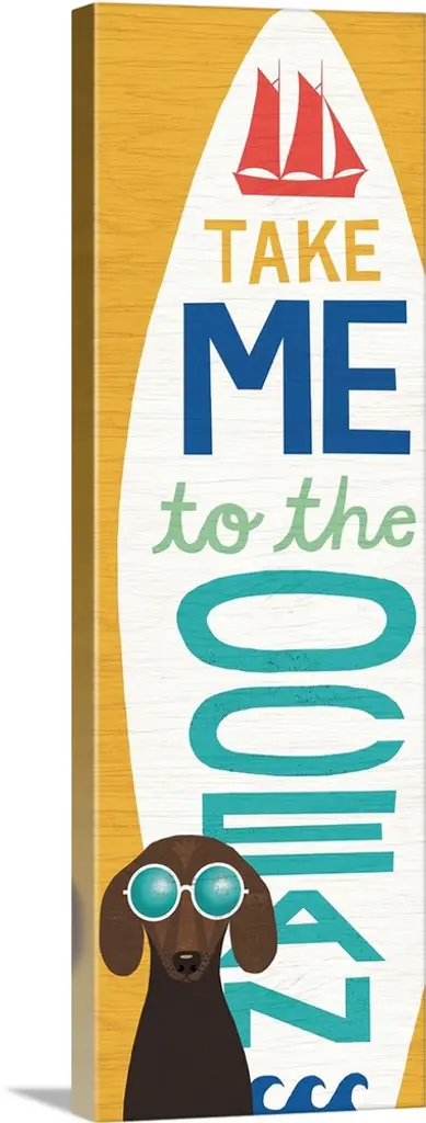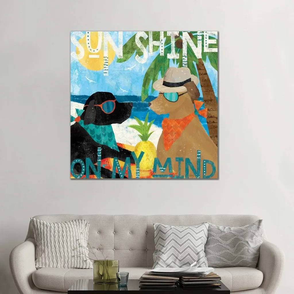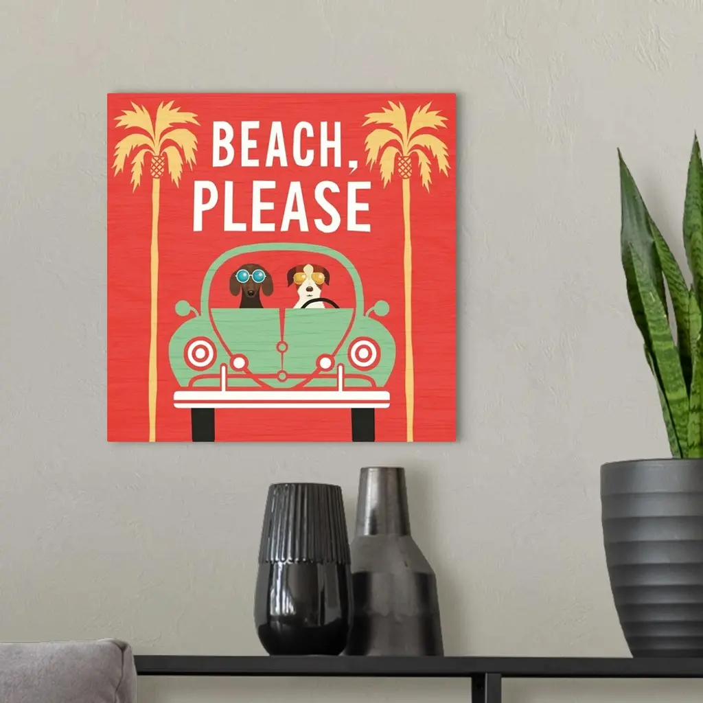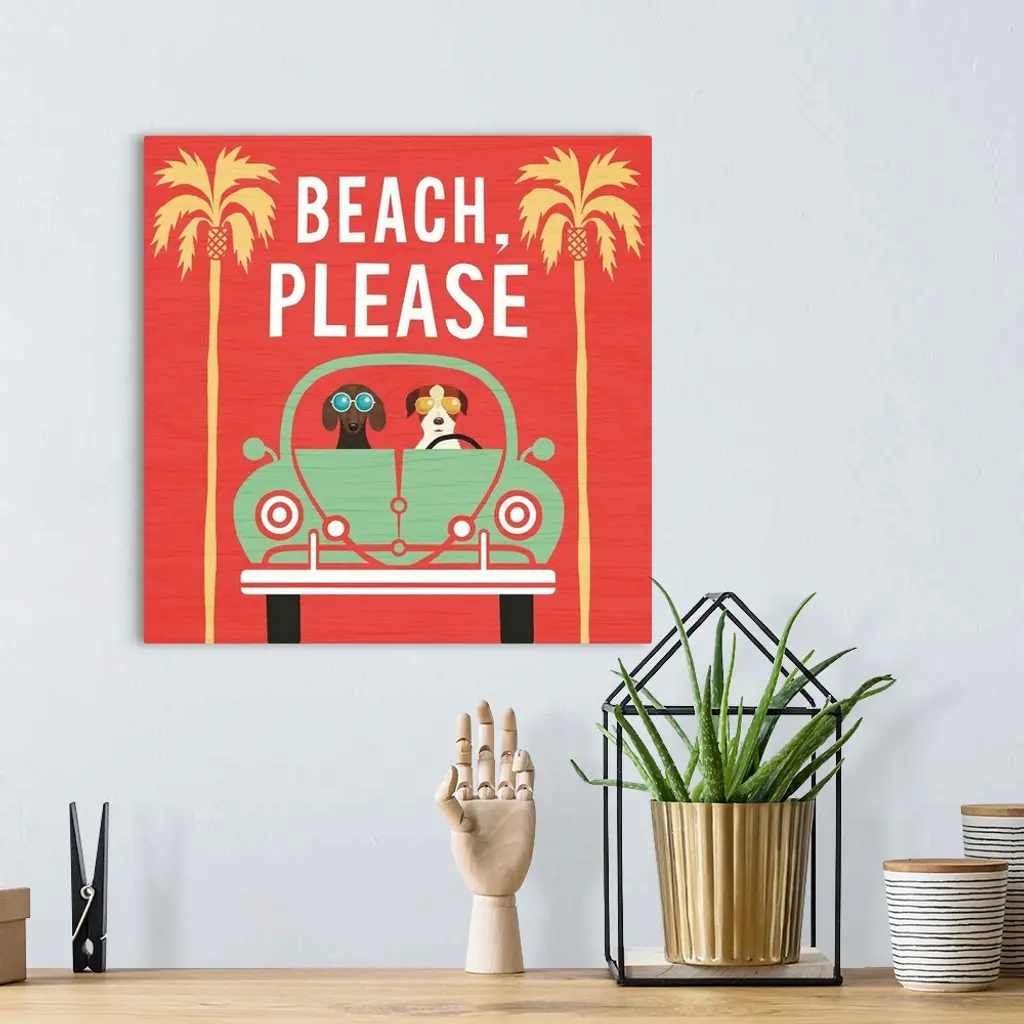 "Beach, Please" illustration of two dogs wearing sunglasses driving in a green car to the beach.