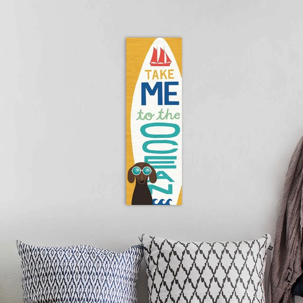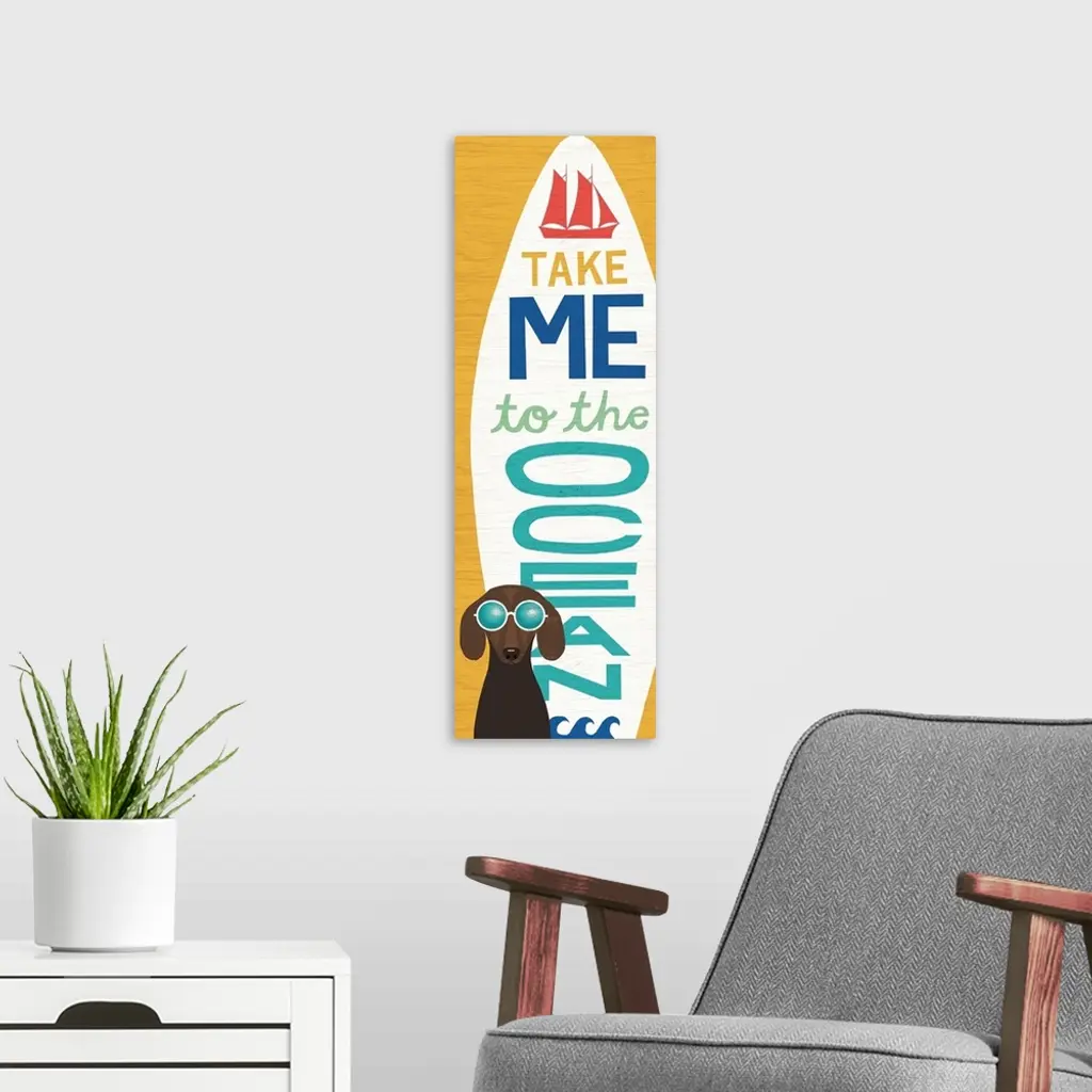 "Take Me to the Ocean" surfboard with a dachshund wearing round sunglasses on a yellow background.