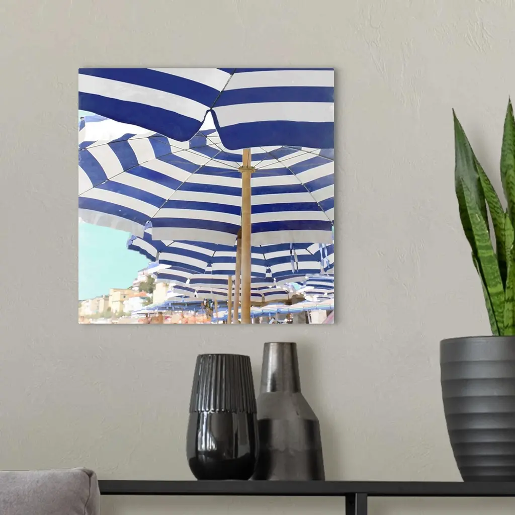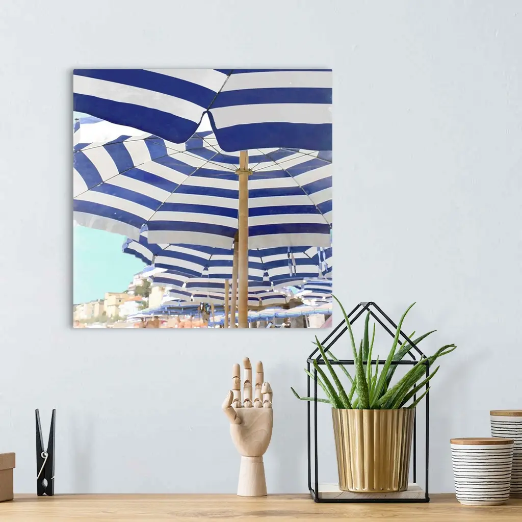 Square decor with blue and white striped beach umbrellas lined up on the beach.