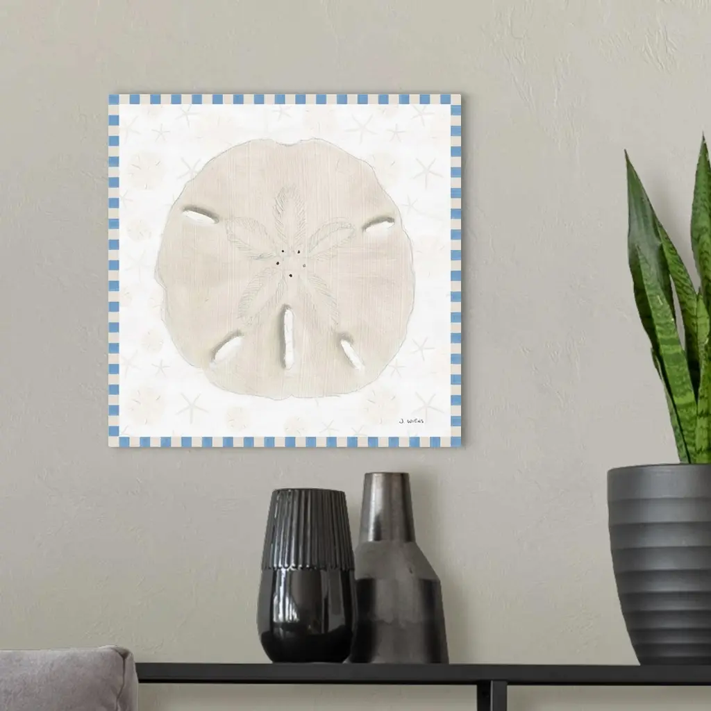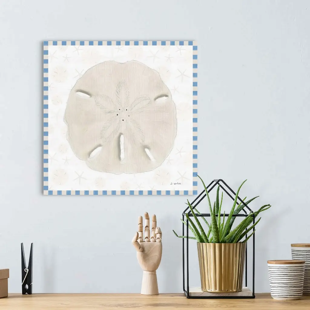 Painted beach decor with a single sand dollar in the center and a blue and off-white checkered border.