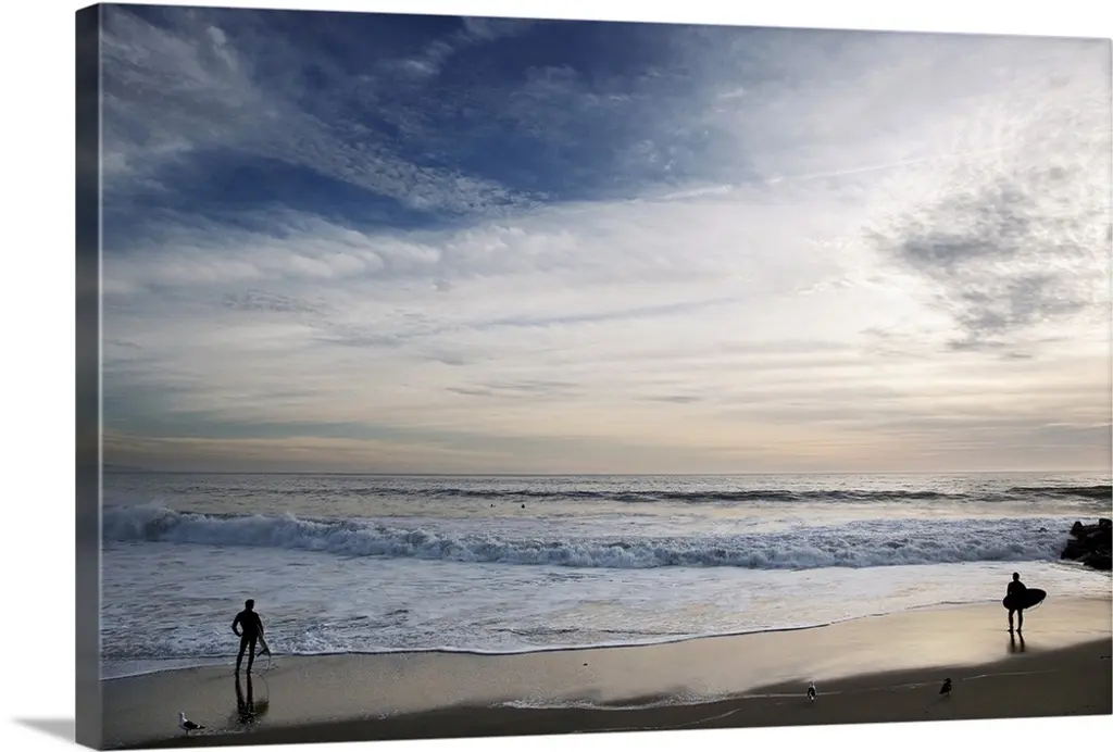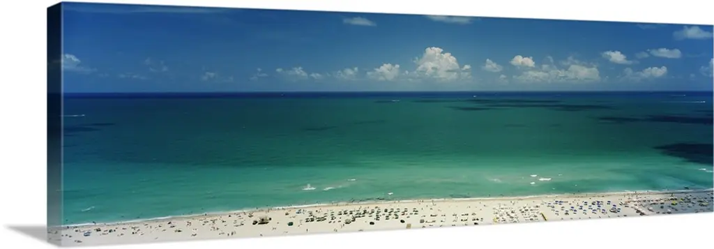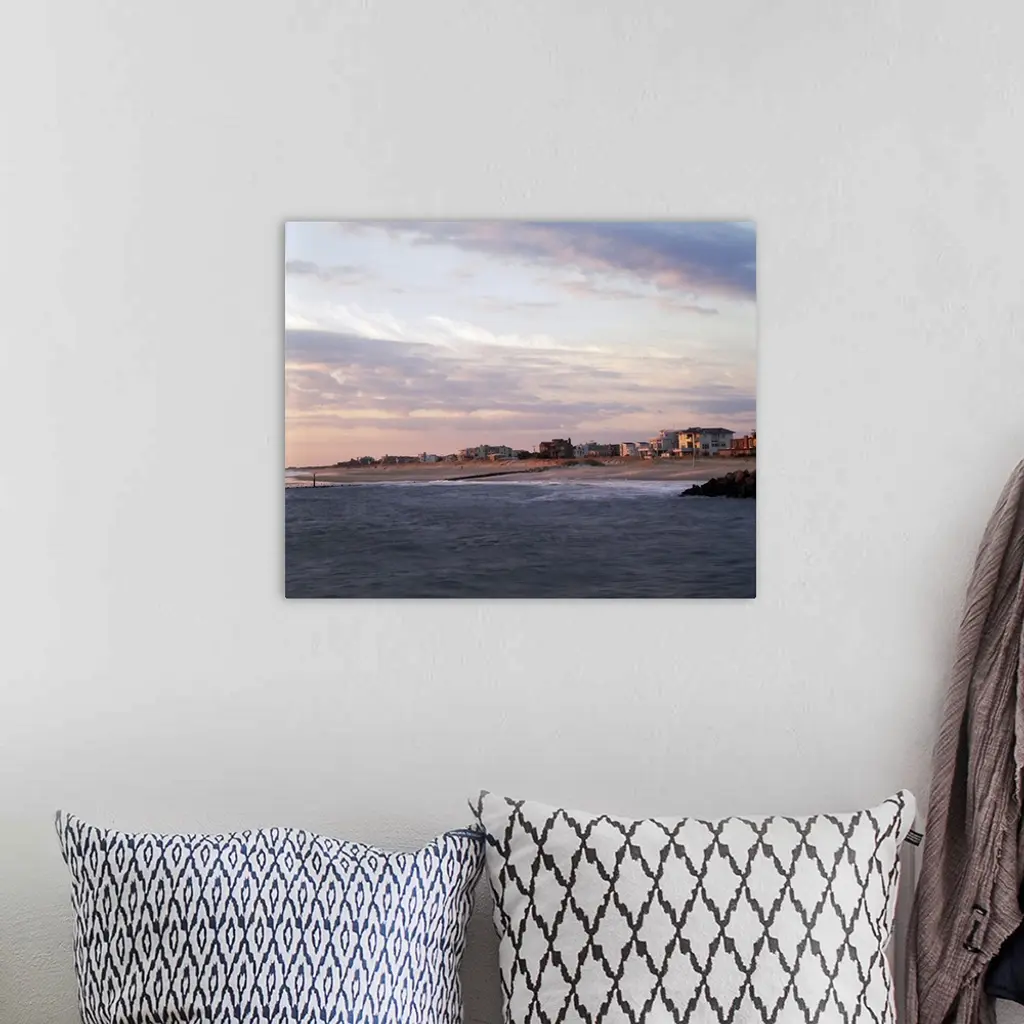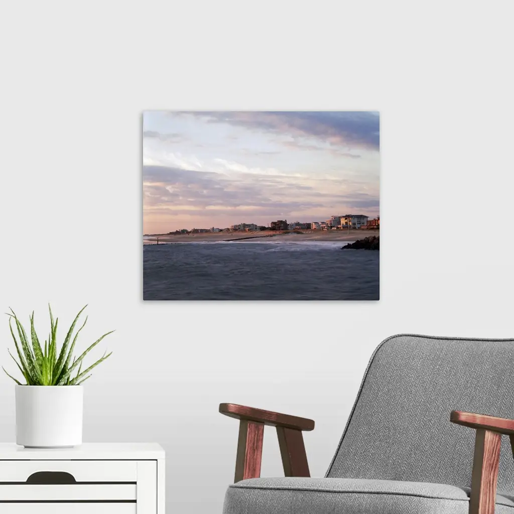 This large piece is a photograph taken on the water looking at the beach coast that is lined with houses.