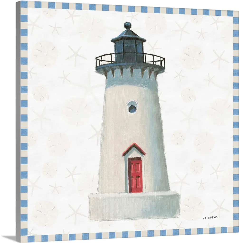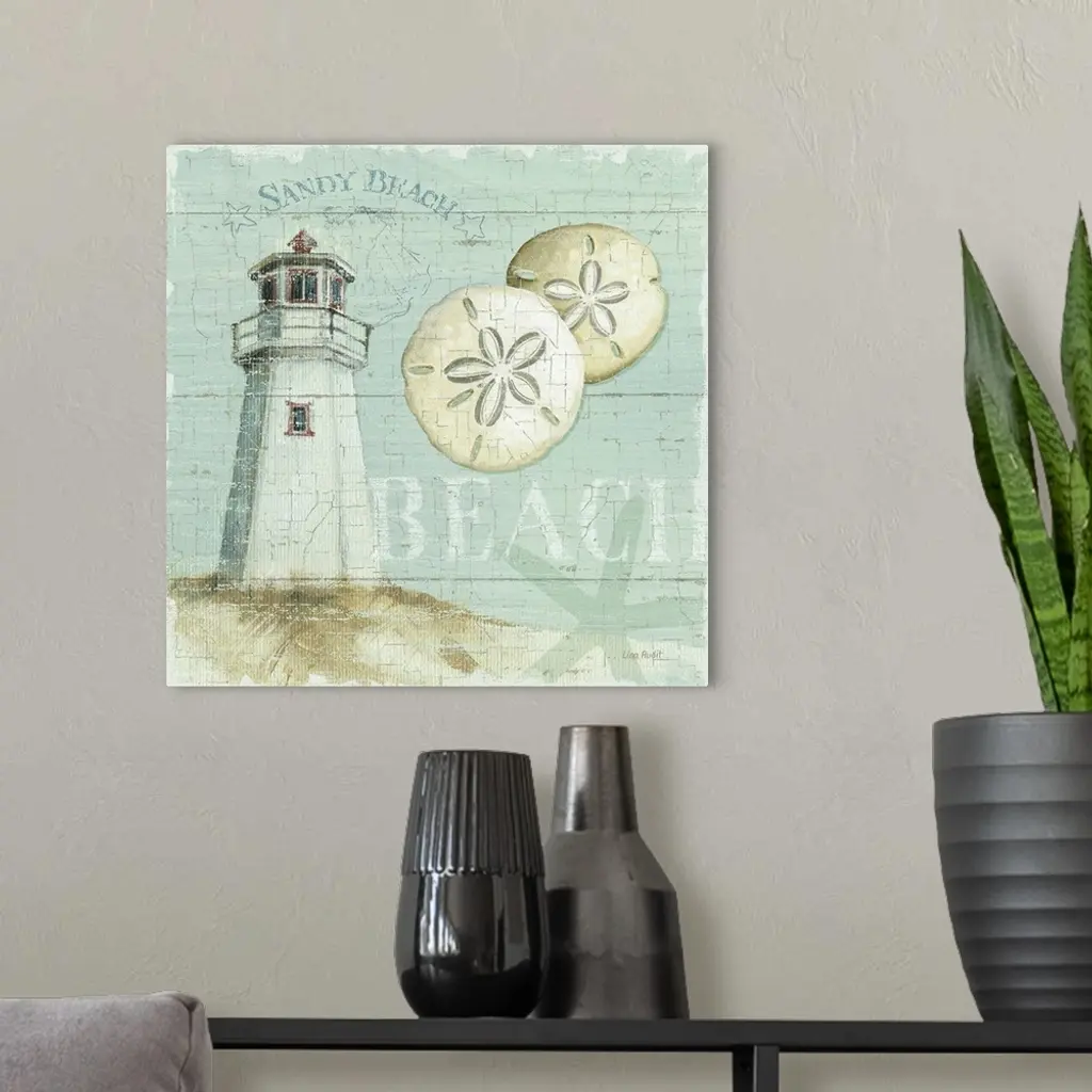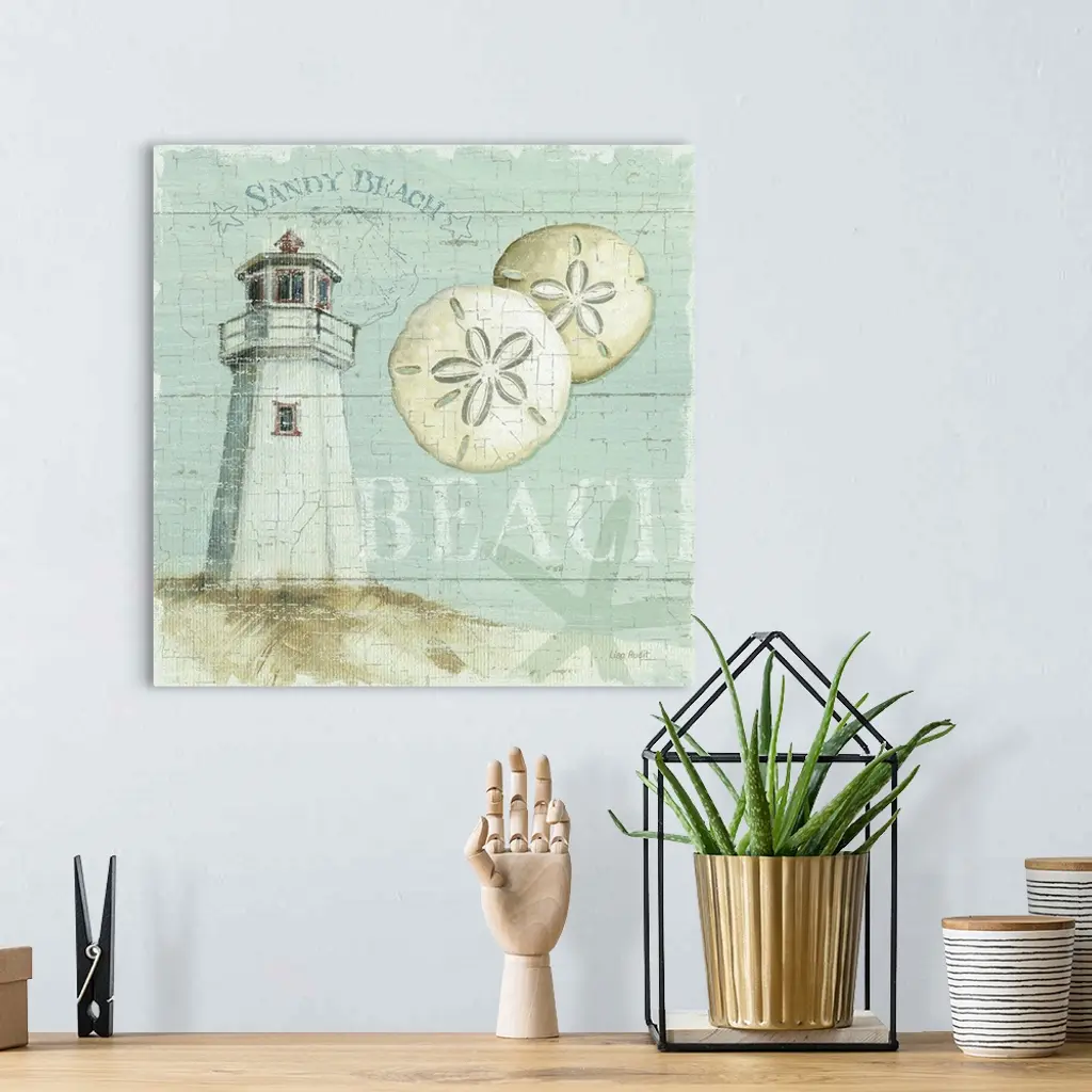 Square shaped docor for the home this decorative accent shows a lighthouse and two floating sand dollars.