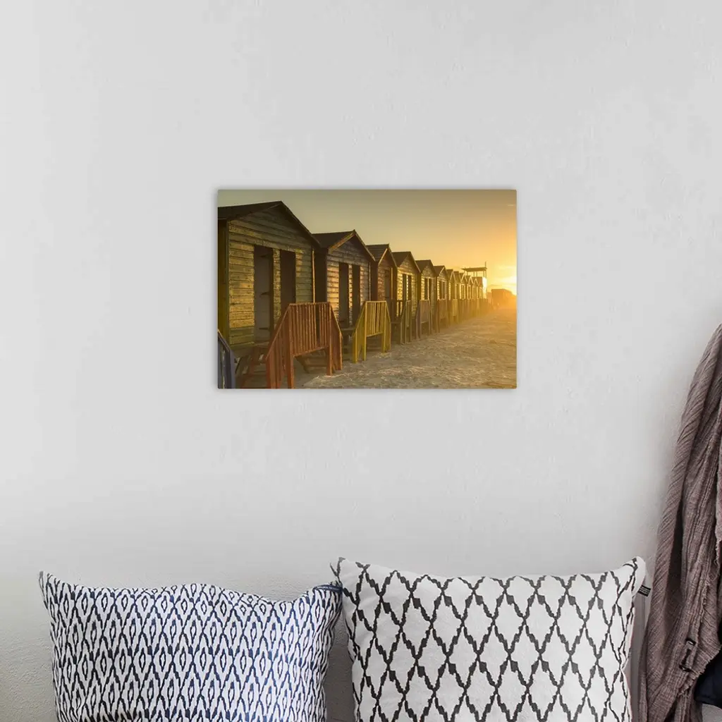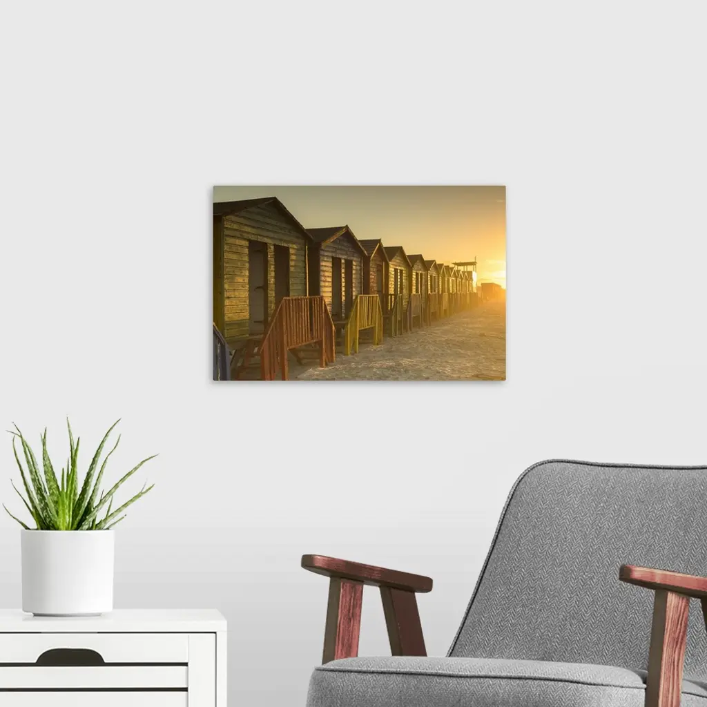 Beach huts on Muizenburg beach at dawn, Cape Town, Western Cape, South Africa