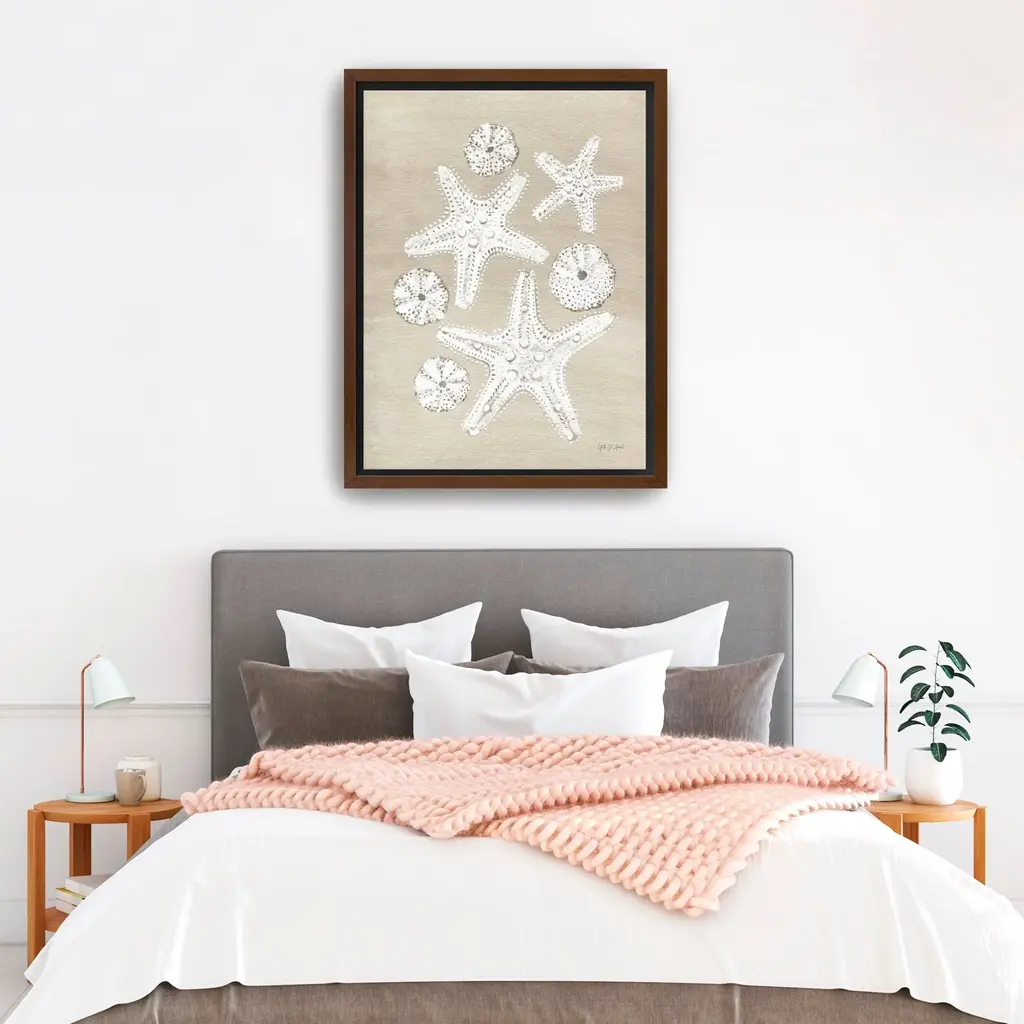 Bring the beauty of the ocean into your home with this enchanting canvas art print, featuring an array of delicate sea shells that evoke the tranquility of coastal living. The soft, soothing colors and intricate details create a serene atmosphere, making it a perfect addition to any space.Available in black frame, dark walnut frame and oak frames, or as a frameless canvas. Our Gallery Wrap Canvas Prints are proudly assembled with high quality materials in California, USA. Each piece is printed on a thick, archival grade canvas using Giclee technology. It is then hand-stretched by our experienced artisans over solid pine bars, which will not warp over time. The final product is a piece personally crafted for you to confidently display on your wall. Care and Assembly: Ensure that the location of your piece has little to no exposure to heat, sunlight, and moisture. Wipe clean, only if needed. Each piece includes a sawtooth hanger to hang on your wall vertically.