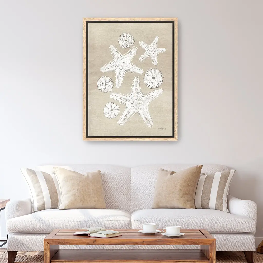Bring the beauty of the ocean into your home with this enchanting canvas art print, featuring an array of delicate sea shells that evoke the tranquility of coastal living. The soft, soothing colors and intricate details create a serene atmosphere, making it a perfect addition to any space.Available in black frame, dark walnut frame and oak frames, or as a frameless canvas. Our Gallery Wrap Canvas Prints are proudly assembled with high quality materials in California, USA. Each piece is printed on a thick, archival grade canvas using Giclee technology. It is then hand-stretched by our experienced artisans over solid pine bars, which will not warp over time. The final product is a piece personally crafted for you to confidently display on your wall. Care and Assembly: Ensure that the location of your piece has little to no exposure to heat, sunlight, and moisture. Wipe clean, only if needed. Each piece includes a sawtooth hanger to hang on your wall vertically.