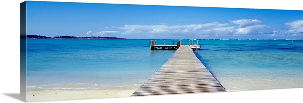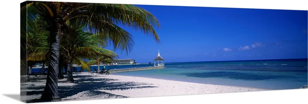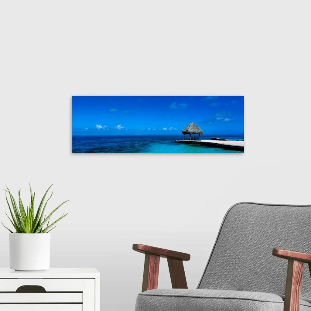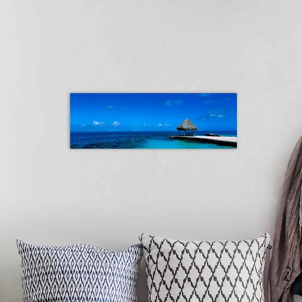 This large wall art is a sweeping panoramic photograph of the ocean horizon and a single shady shelter on the edge of the shore.
