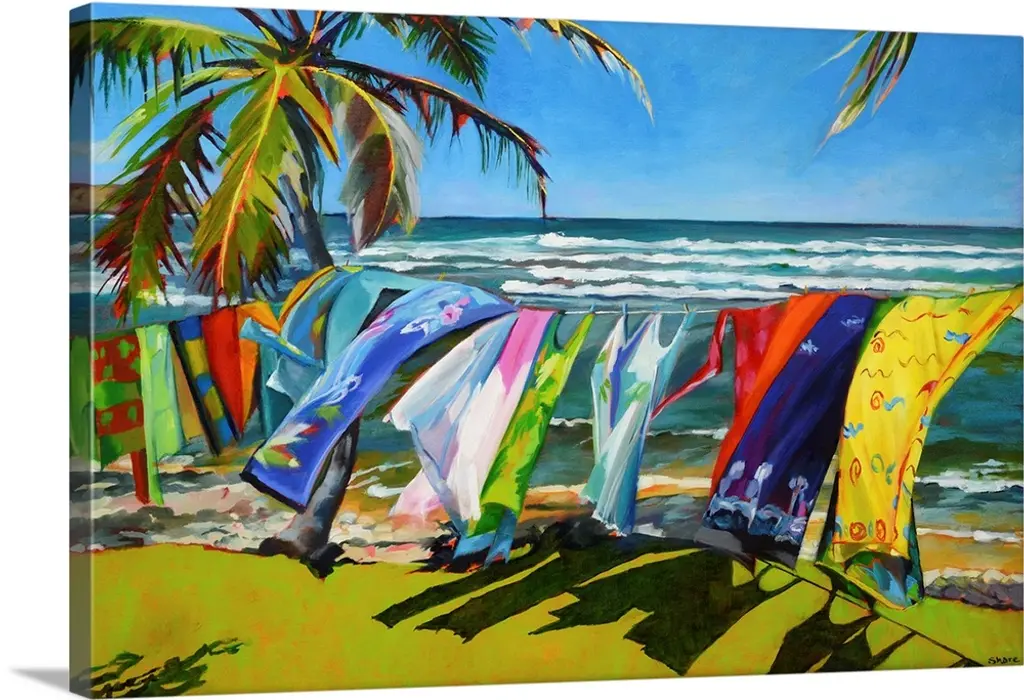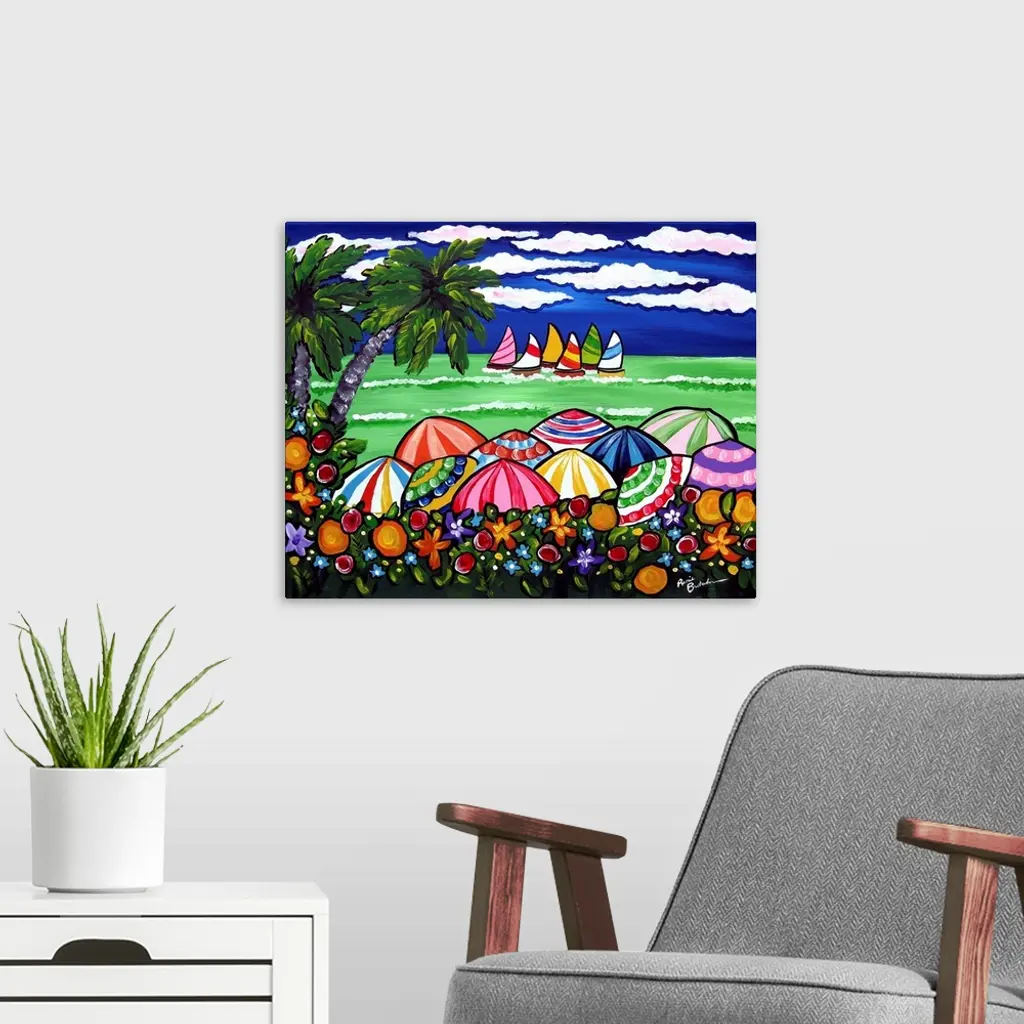 Wildflowers, palm trees, colorful beach umbrellas, and sailboats in the ocean on a beautiful day with vibrant colors.