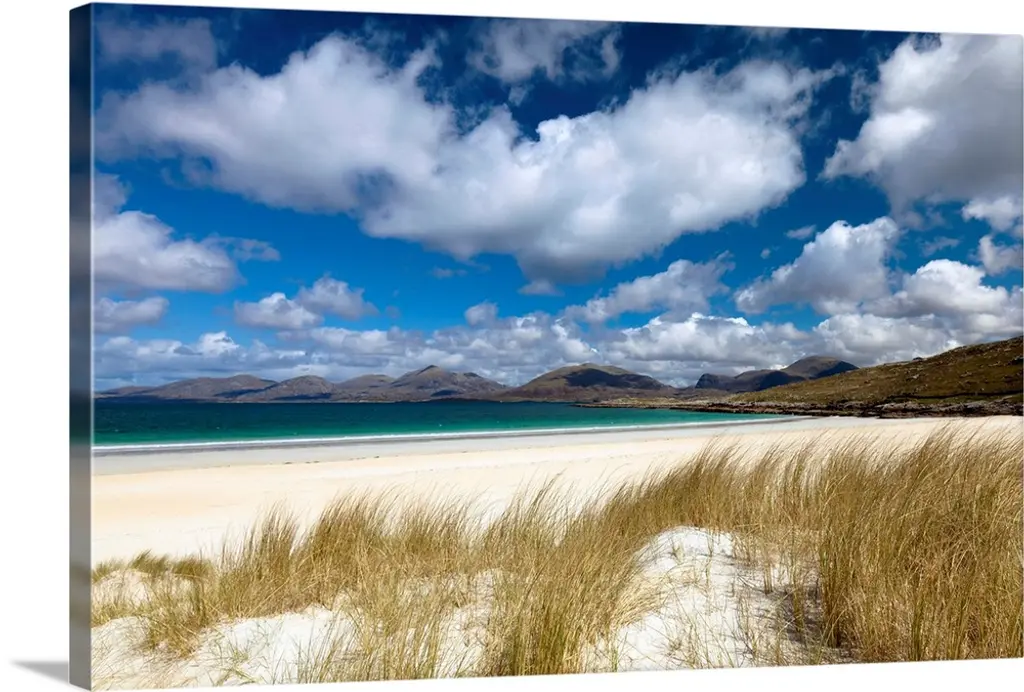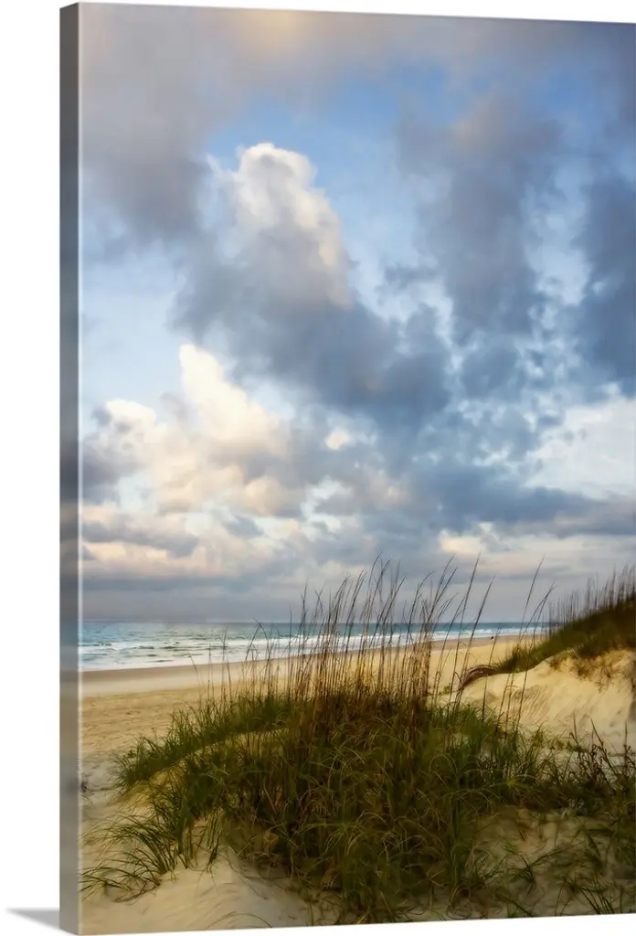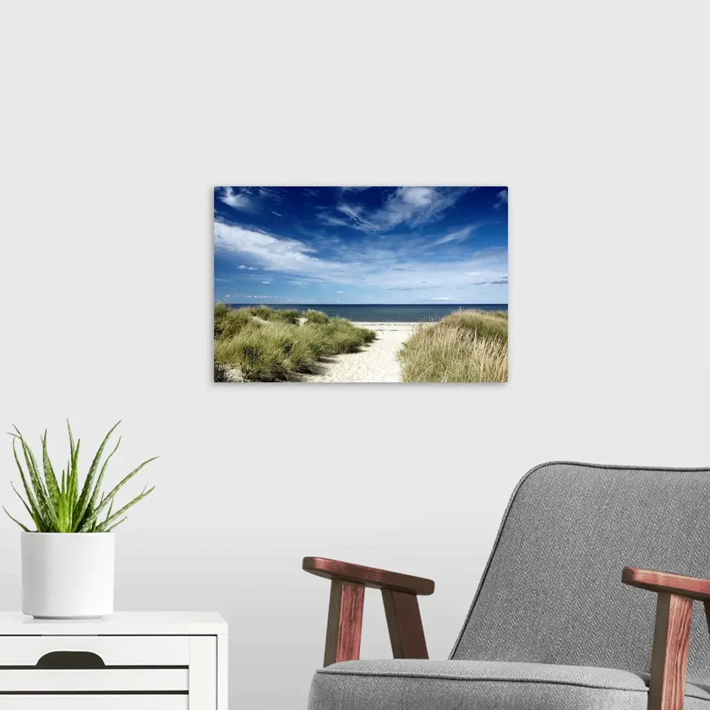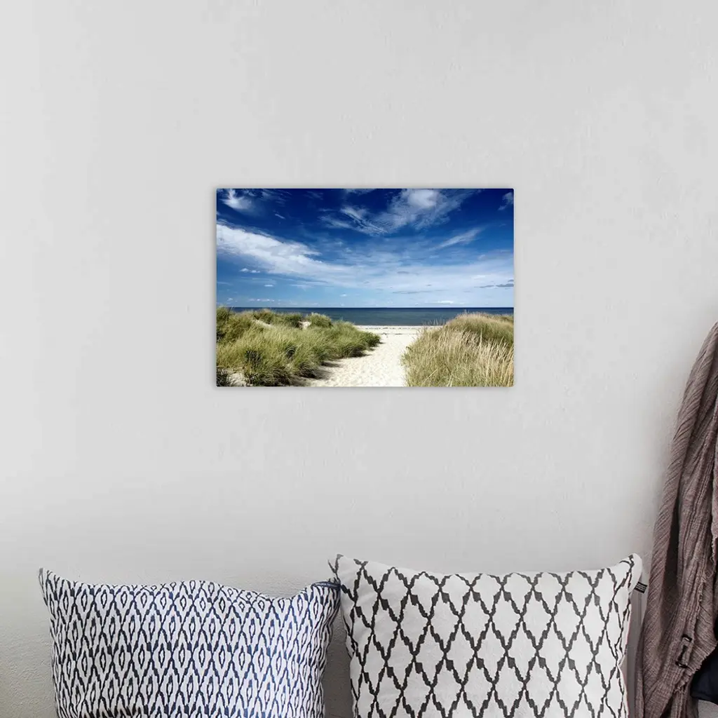 Photograph of sandy walkway lined by tall grass leading to a beach and calm ocean under cloudy skies.