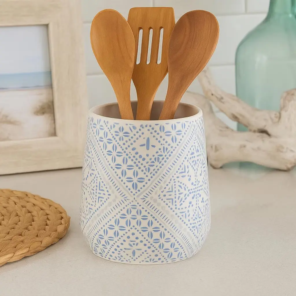 Add style and functionality to your kitchen with this geometric textured cylindrical utensil holder. Crafted from premium stoneware, it’s perfect for storing spatulas, whisks, and other kitchen tools. Its versatile design complements coastal and farmhouse décor, making it a great gift.