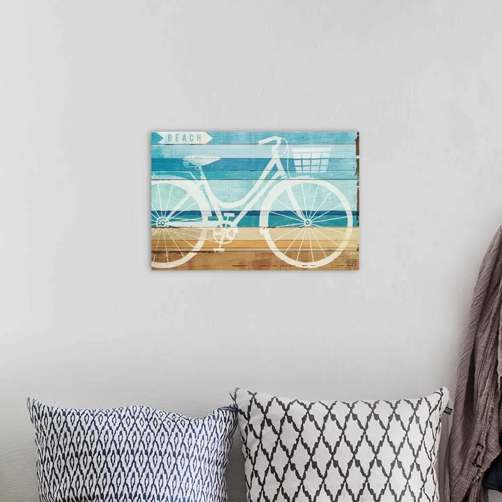 White silhouette of a bicycle and a sign pointing to the beach on a wood panel background.