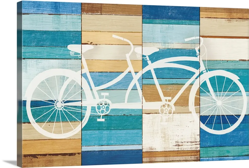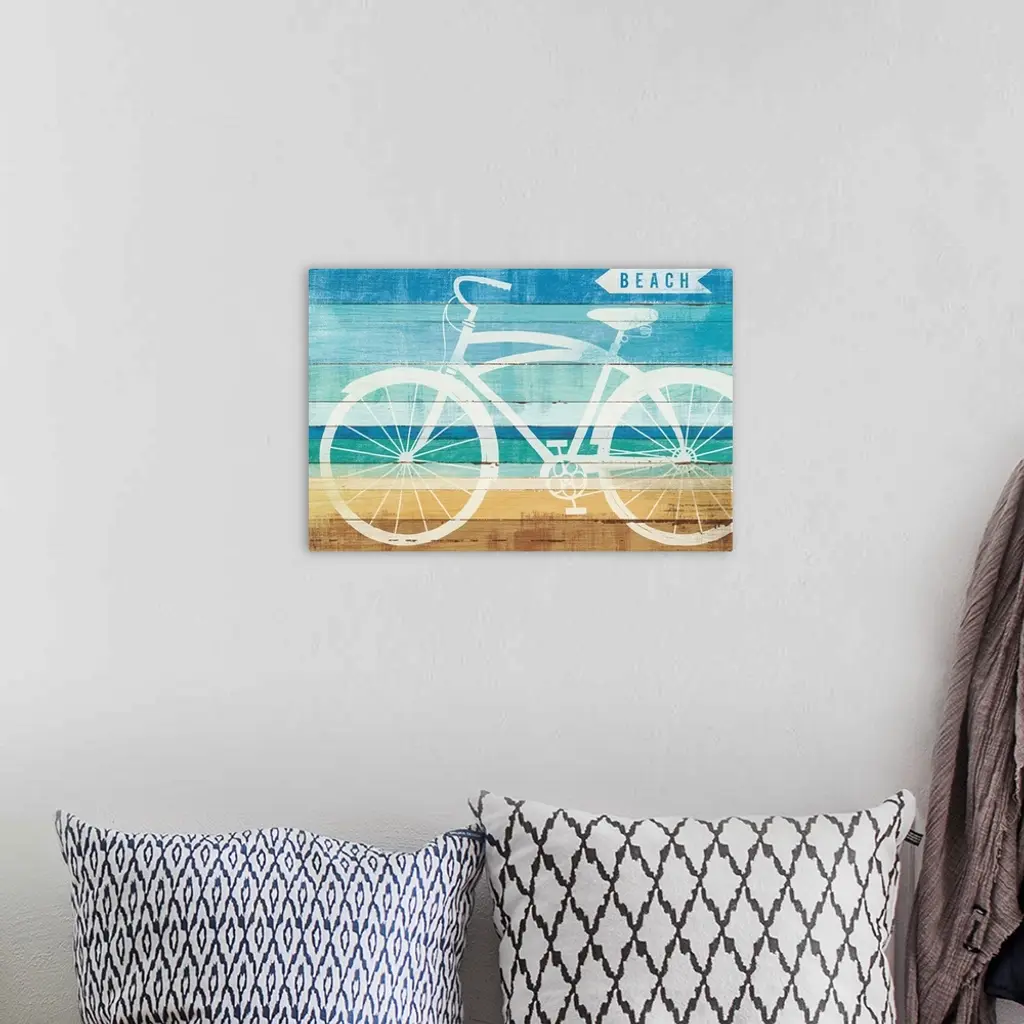 White silhouette of a bicycle and a sign pointing to the beach on a wood panel background.
