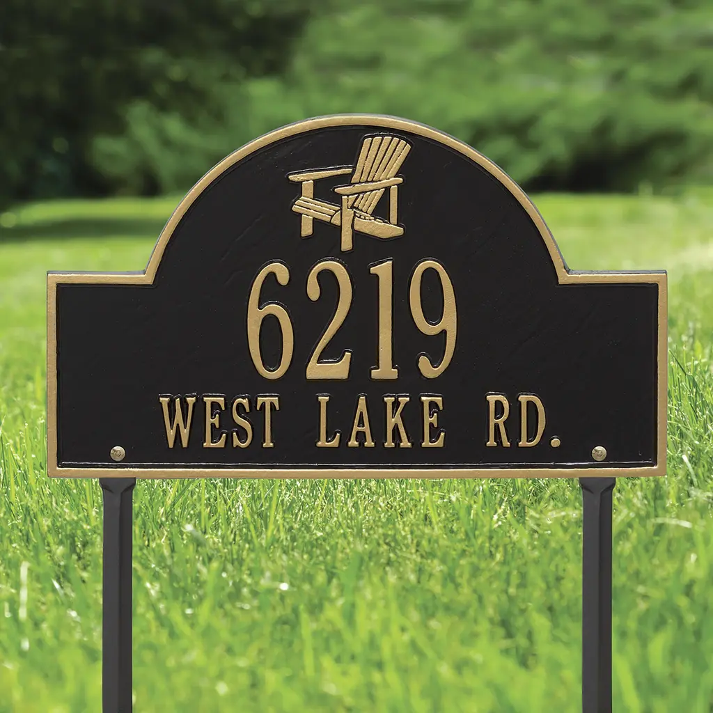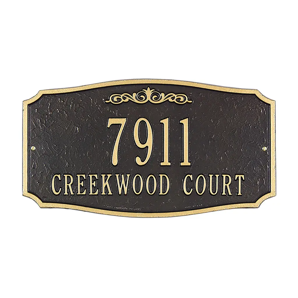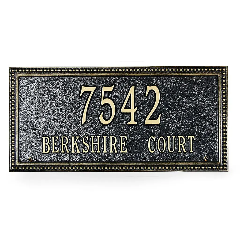 Display your address with our high-quality Beaded Cast Aluminum Wall or Lawn Plaque. Custom-made in the USA from recycled cast aluminum, the wall and lawn plaques feature a beaded border to add distinction to your address. Both feature raised metallic-hued lettering on a background color of your choice. Powder-coat finish protects them from the elements. Lawn plaque comes with all-weather aluminum 18" stakes and mounting hardware.