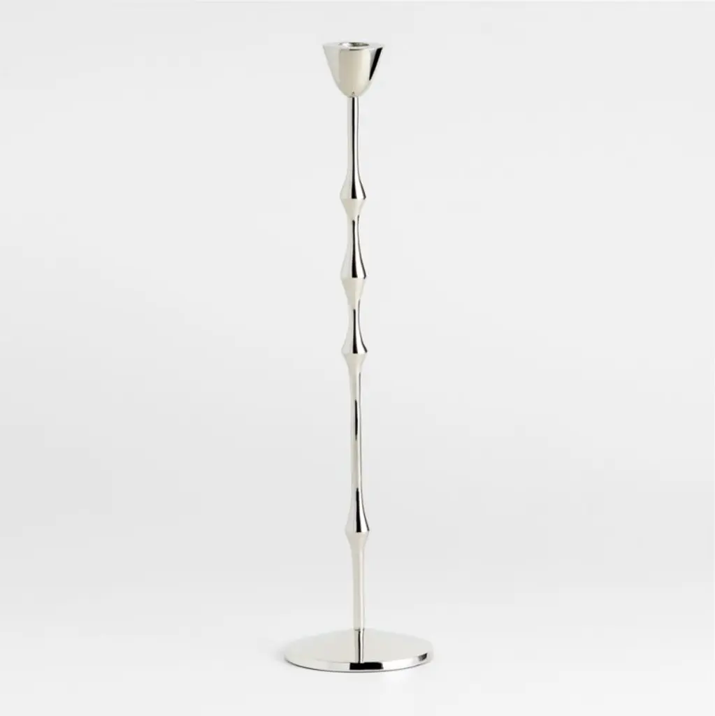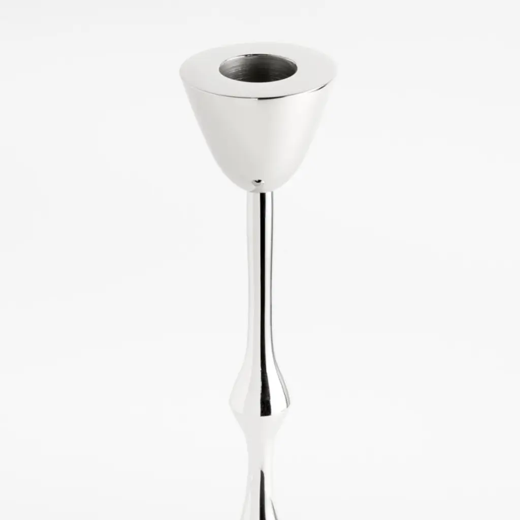 Our take on traditional ornate candlesticks, this taper holder stretches and streamlines the classic silhouette into something sculptural and abstract. Crafted of cast brass with a nickel finish, the candlestick evokes a stream of molten silver. We especially love the way candlelight gleams on the highly polished chrome. Pair the large beaded taper holder with the smaller coordinating candlesticks to set the table with modern glam.