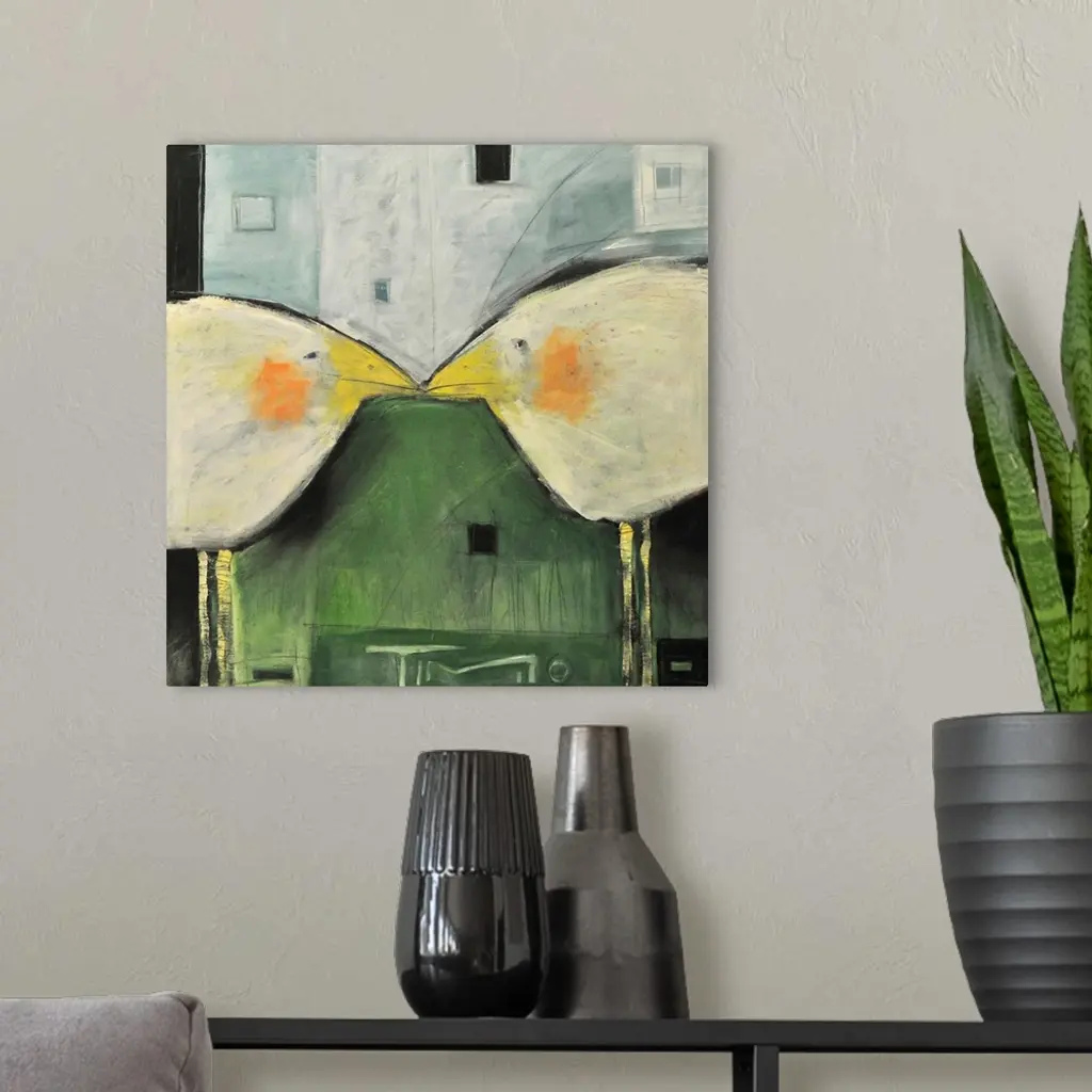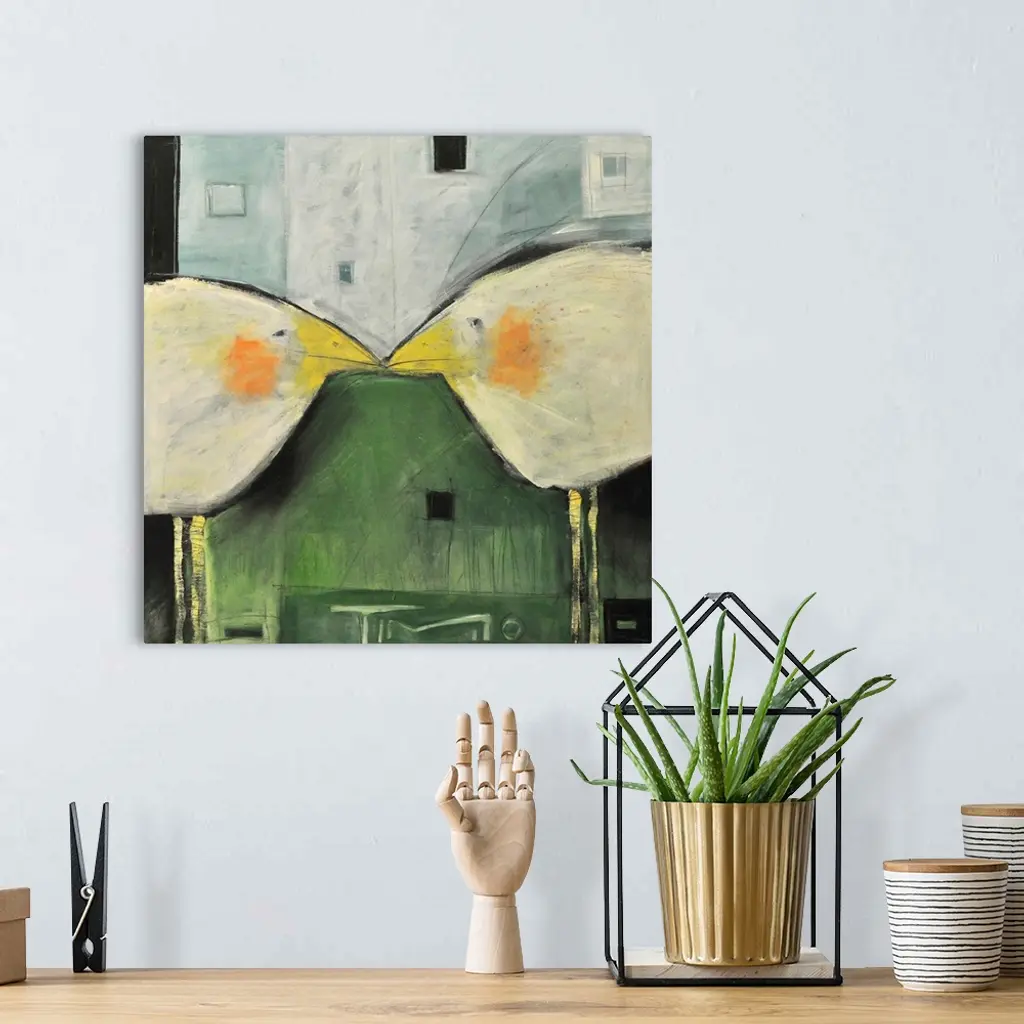 Two large birds are painted in an abstract form with their beaks touching in the middle of the print.