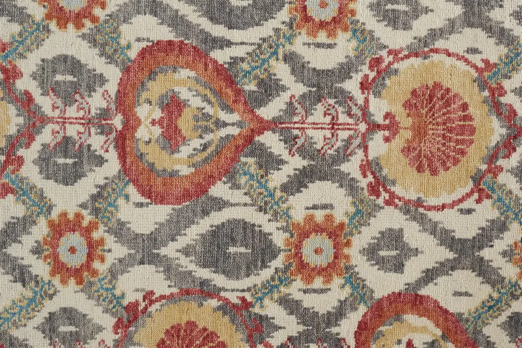 Collection: Beall Colors: Orange, Gray Construction: Hand Knotted Material: Face: 100%Wool / Warp: Cotton Pile: Low Pile Pile Height: 0.28" Styles: Traditional,Bohemian & Eclectic Backing: Cotton Made In: India Thickness: 0.28" Price Range: $$$$$ (Affordable)