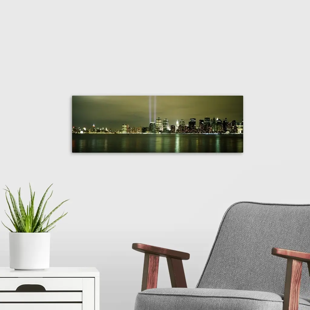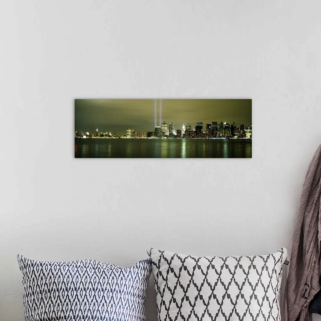 Panoramic cityscape on canvas of NYC lit up with two beacons of light shooting upwards in place of the World Trade Center buildings.