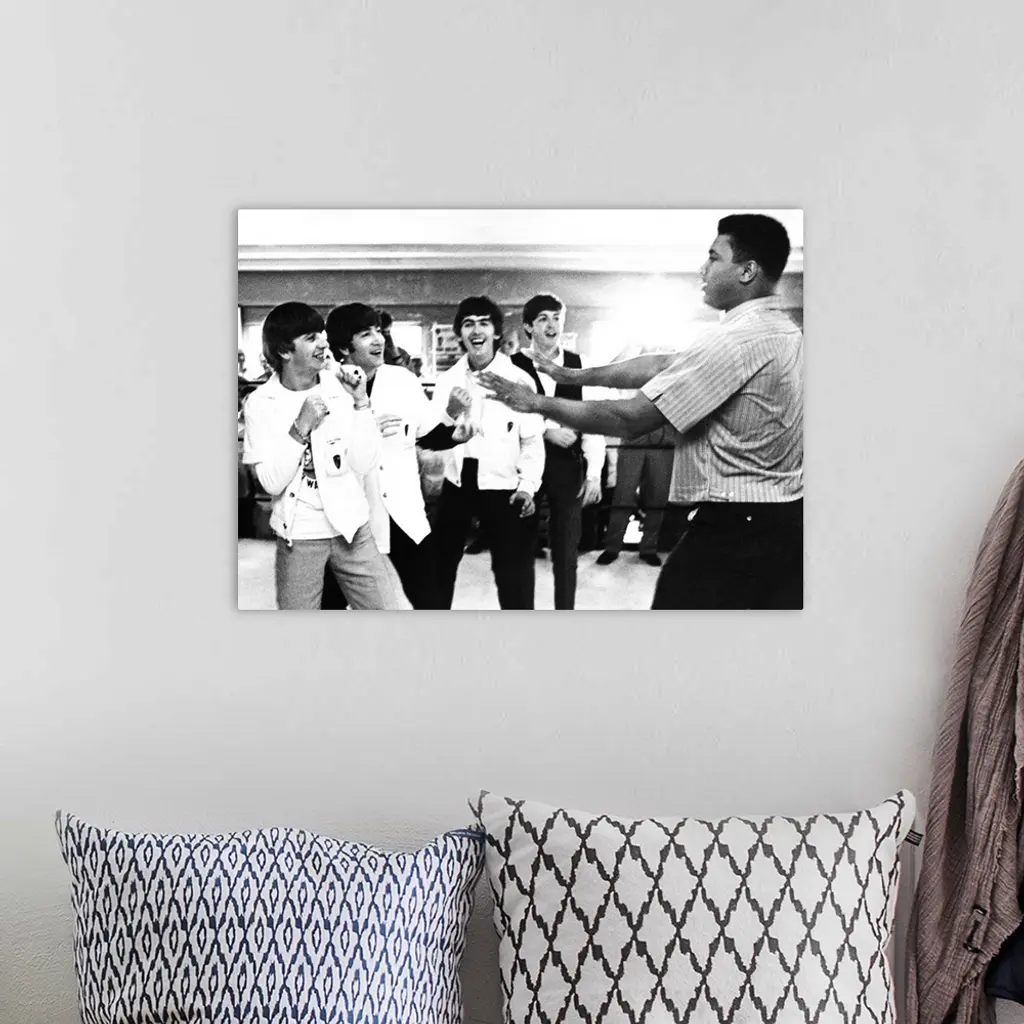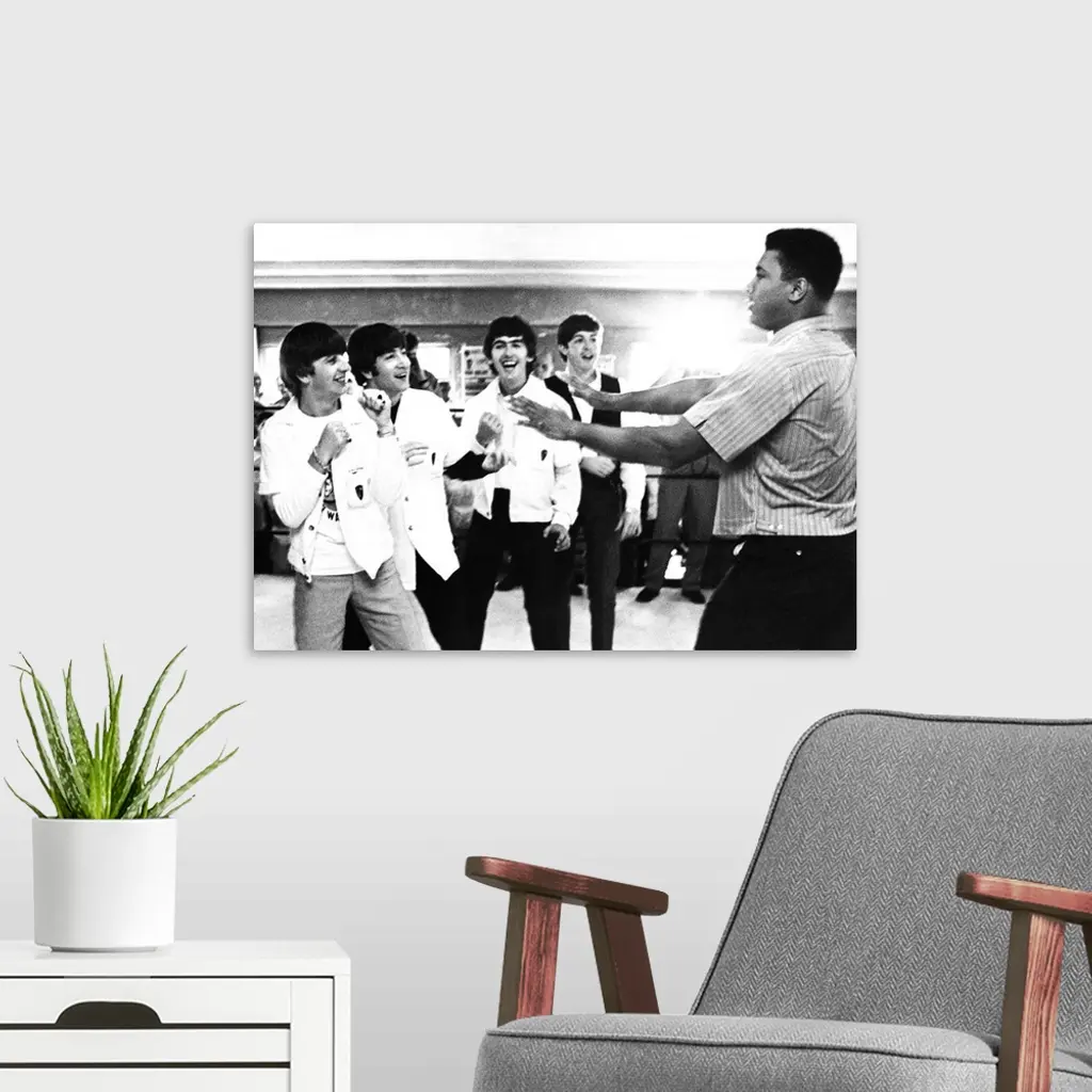 The Beatles (from left: Ringo Starr, John Lennon, George Harrison, and Paul McCartney) clowning with boxer Cassius Clay (later Muhammad Ali) at his training camp in Miami Beach, Florida, 18 February 1964, one week prior to his heavyweight championship fight with Sonny Liston.
