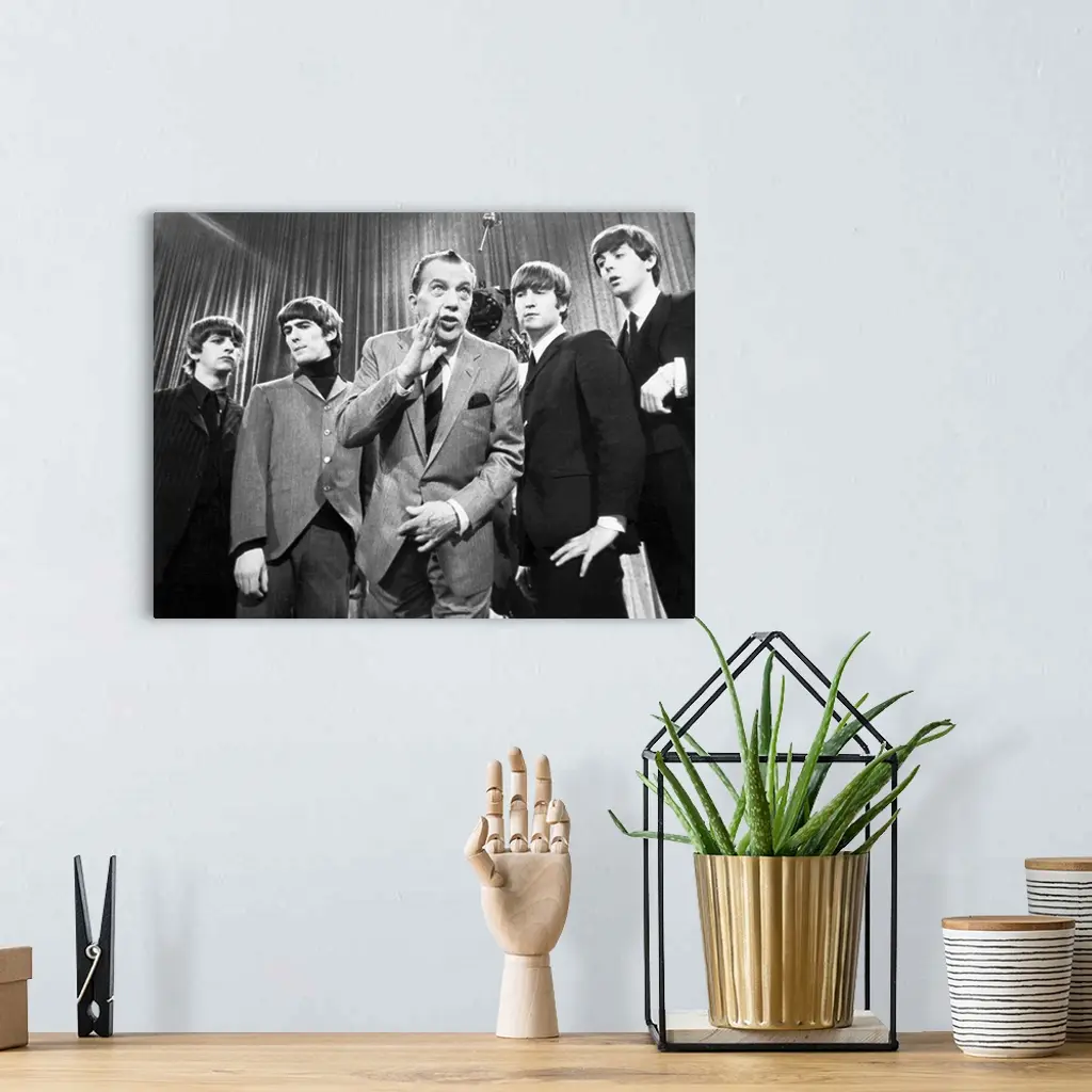 The Beatles photographed on the set of 'The Ed Sullivan Show' on 9 February, 1964. From left: George Harrison, Ringo Starr, Ed Sullivan, John Lennon, Paul McCartney.