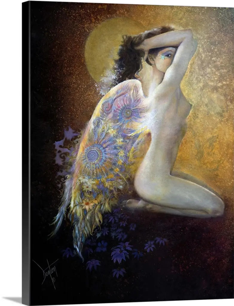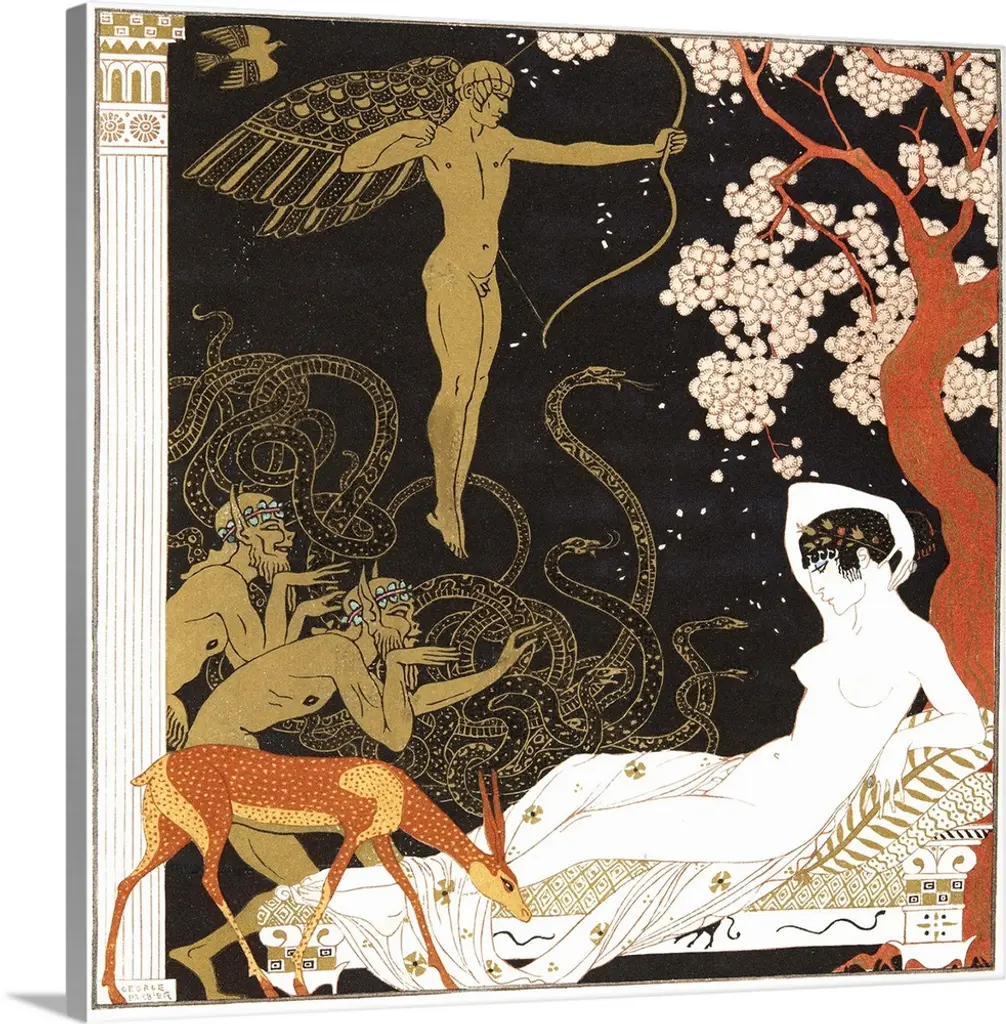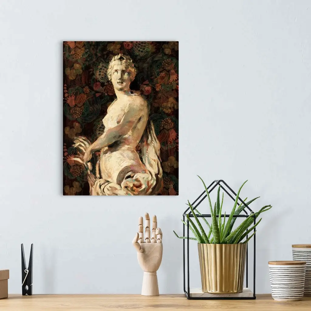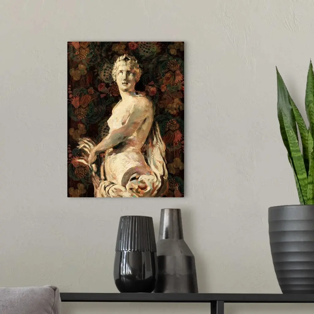 An elaborate patterned background provides a striking contrast to the form of a classical Greco-Roman statue of a woman.
