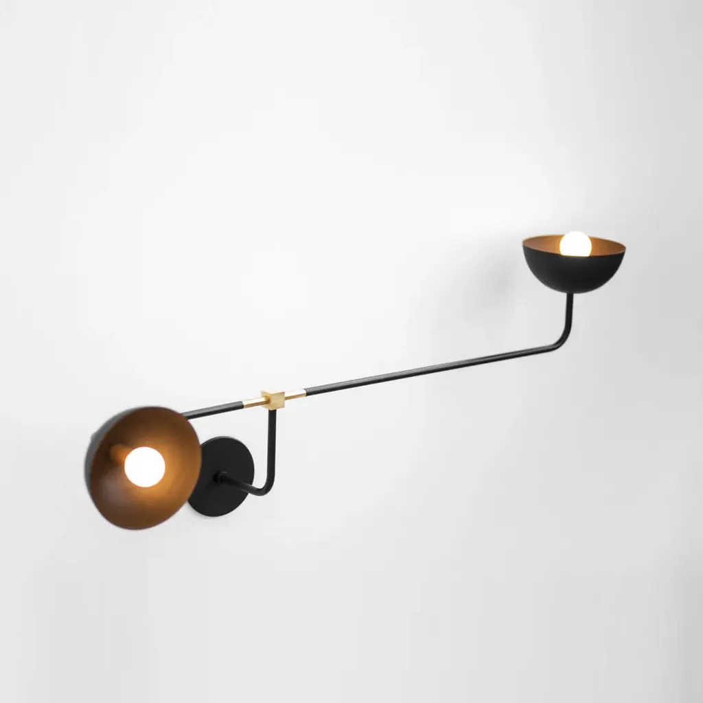 Beaubien extends the collection’s industrial aesthetic in a handsome double-light wall model. Two metal shades are mounted on a steel rod with one facing out, the other sideways—and the fixture can be mounted either vertically or horizontally as needs dictate. Milk glass globes provide warm, diffused LED illumination as it’s reflected off the shades’ golden interior. Lambert & Fils' uncommon lighting is completely handmade at the brand's Montreal atelier.