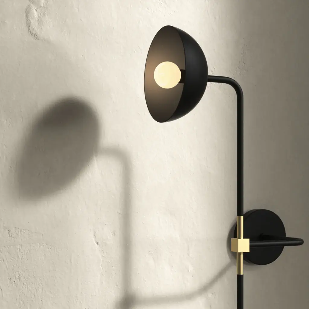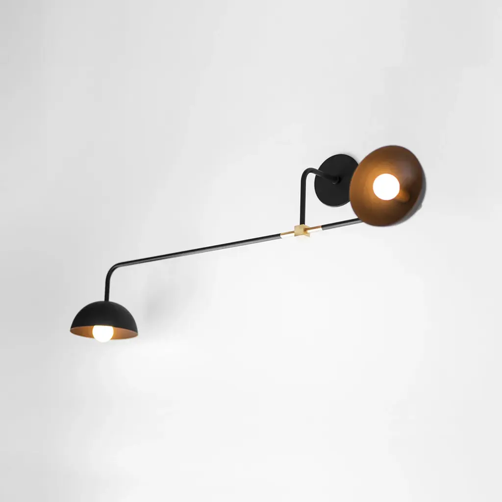 Beaubien extends the collection’s industrial aesthetic in a handsome double-light wall model. Two metal shades are mounted on a steel rod with one facing out, the other sideways—and the fixture can be mounted either vertically or horizontally as needs dictate. Milk glass globes provide warm, diffused LED illumination as it’s reflected off the shades’ golden interior. Lambert & Fils' uncommon lighting is completely handmade at the brand's Montreal atelier.