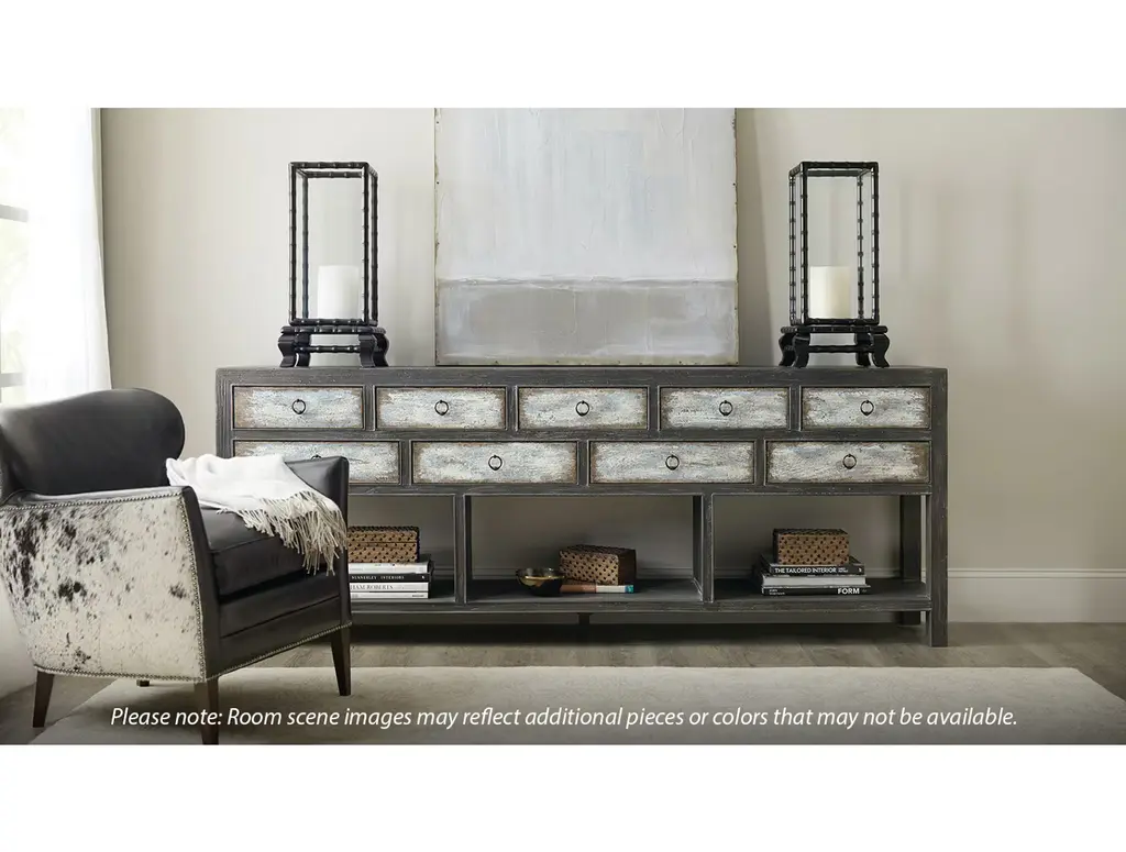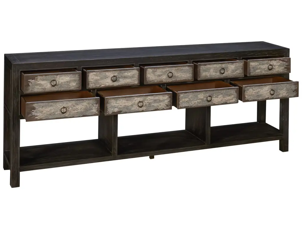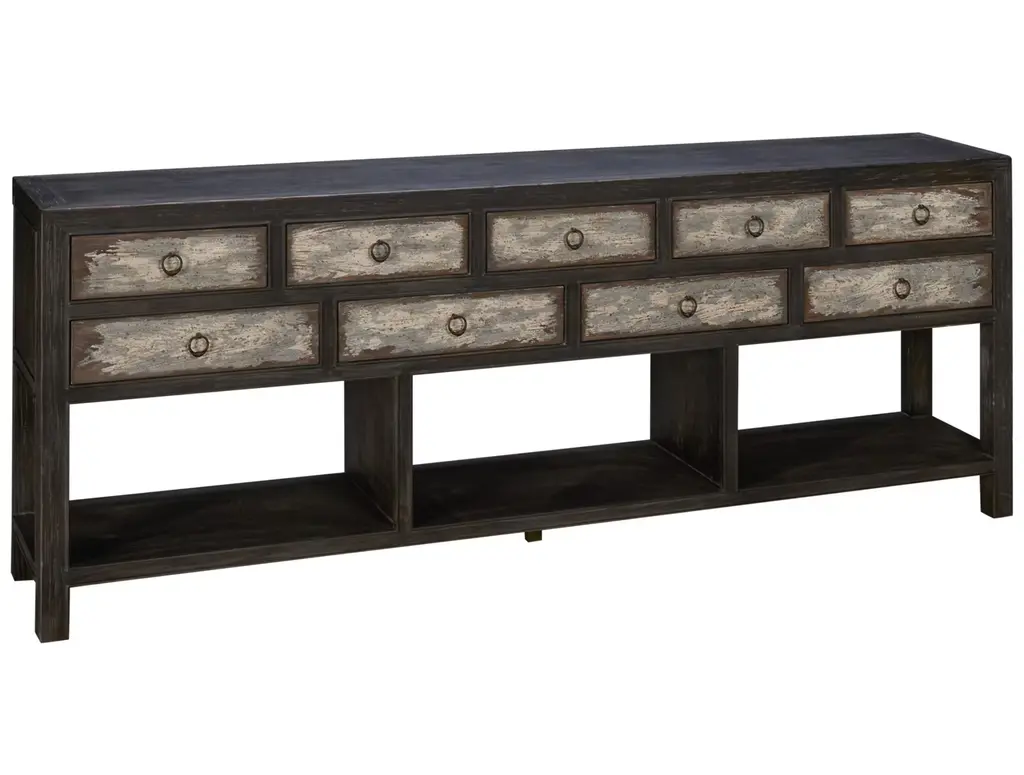The Beaumont Console is a one-of-a-kind piece, inspired by American antiques and the concept of upcycling... the process of giving new life to vintage items with updates such as refinishing or repurposing them for new and unique uses. With 9 drawers, a generous top, and 3 open areas along the bottom shelf, this console offers plenty of storage and display options.