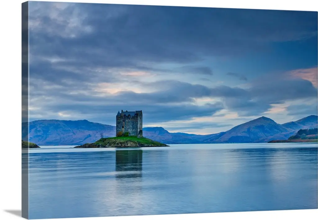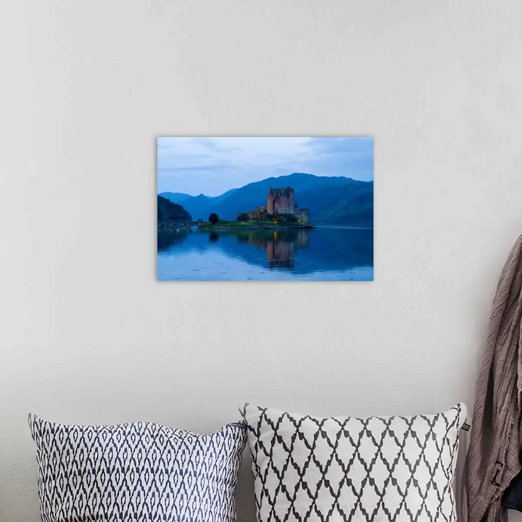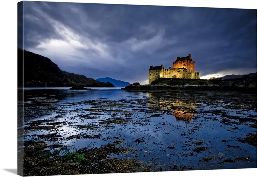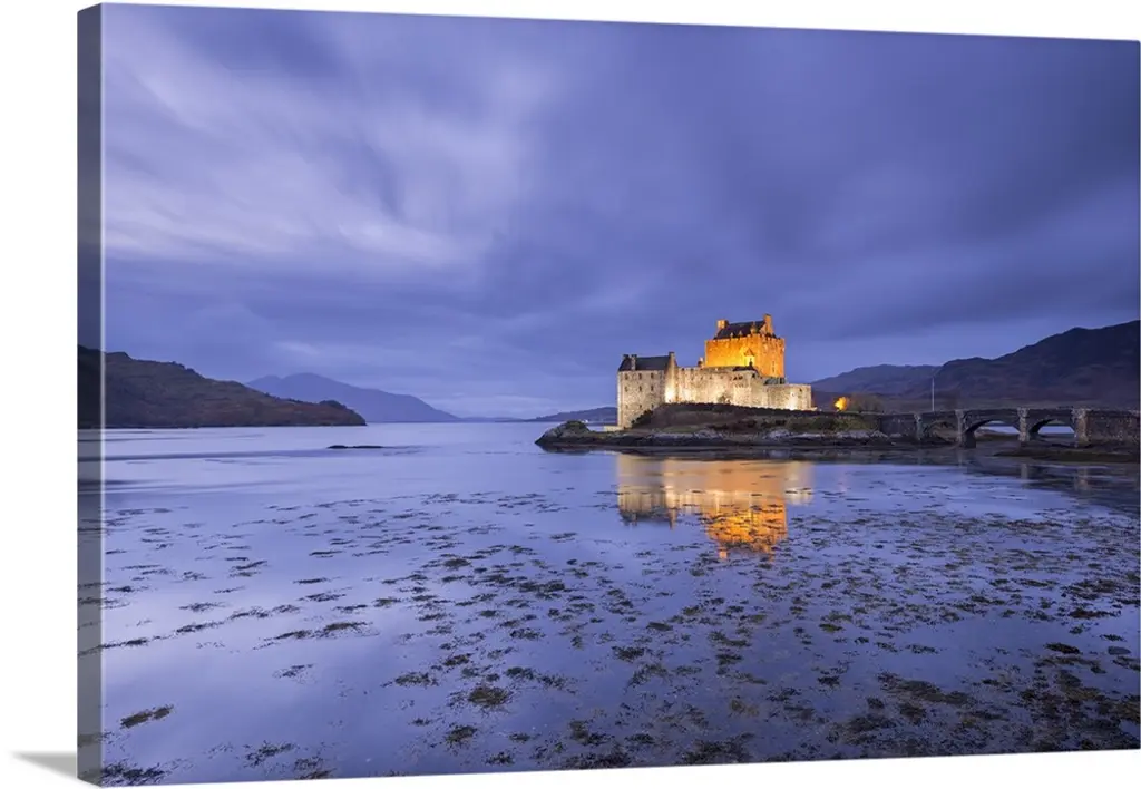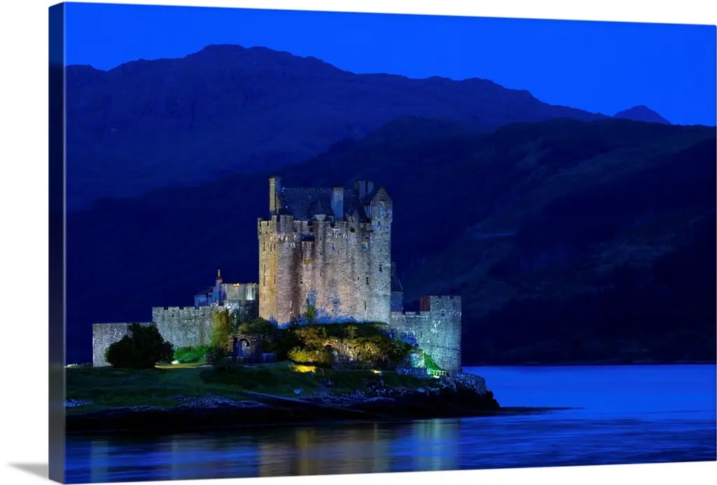 Beautiful Eileen Donan Castle in Western Dornie in Highlands os Scotland the most photographed castle in the world at night with reflections on still beautiful waters