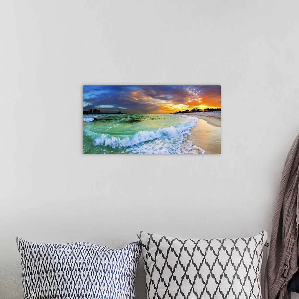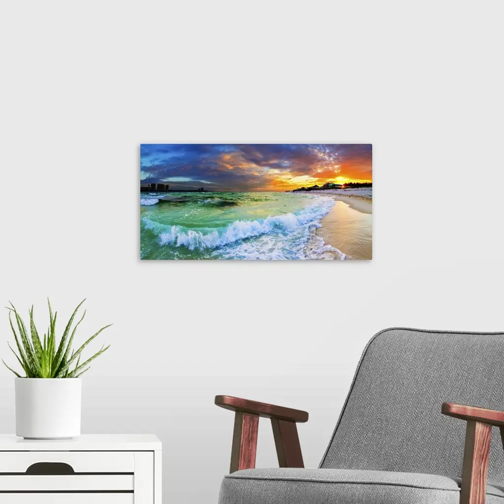 Beautiful ocean sunset with crashing waves and a vibrant red sunset on the beach. Makes a great panoramic canvas print.