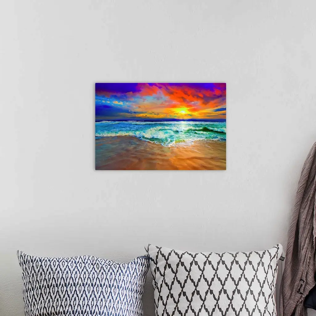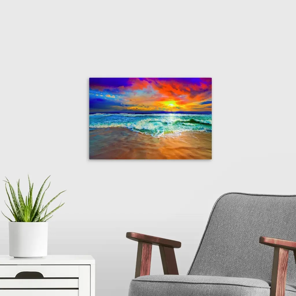 This beautiful ocean sunset is a vibrant red landscape. This is part of the colorful beach photography collection with a beautiful beach and crashing waves on the ocean seashore.