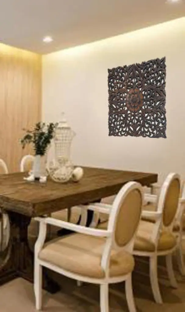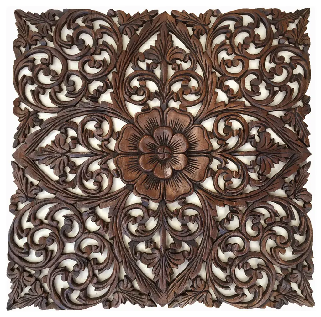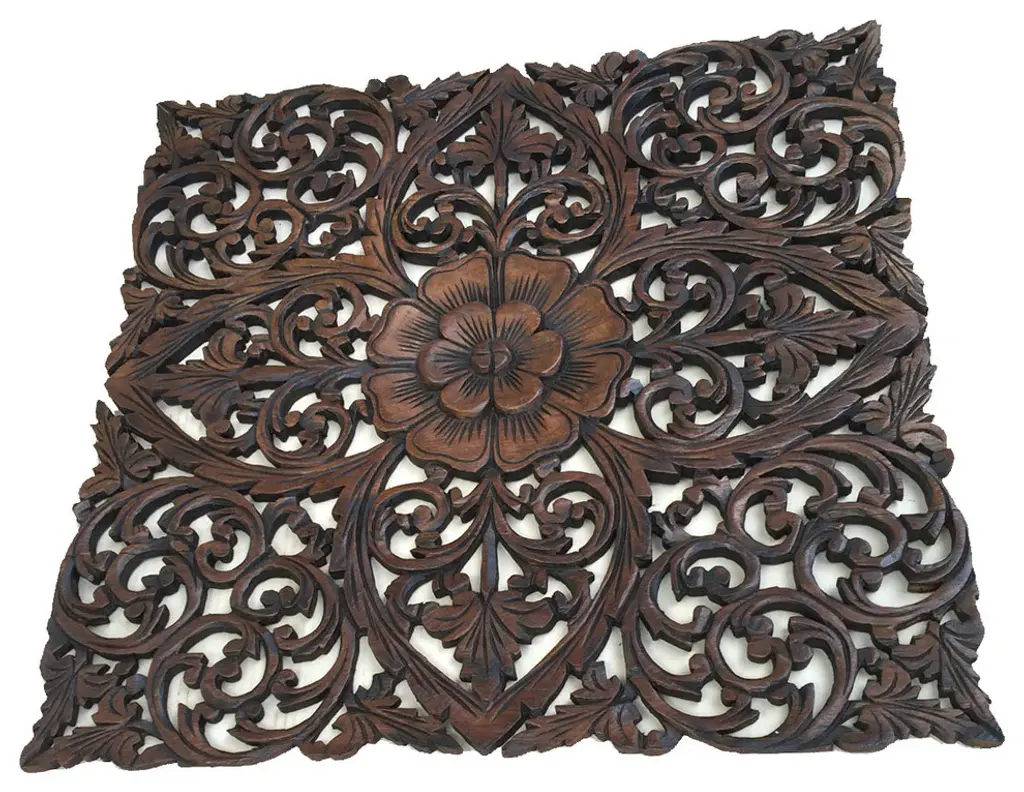 Beautify your wall with this contemporary decorative floral wall hanging 24"Square. Made from teak wood. This oriental carved wood plaque will add a captivating elegance to your room.Size • Weight • Color • MaterialsHeight: 24 InchesWidth: 24 InchesThickness: 0.5 InchesWeight: 5.5 lbs.Color: Dark BrownMaterial: Teak WoodPlease note that you may see a slight difference in color as compared to that seen on your computer screen. Also, since most products are handmade and they are crafted from natural wood, there may be a slight size variation. Shipping: