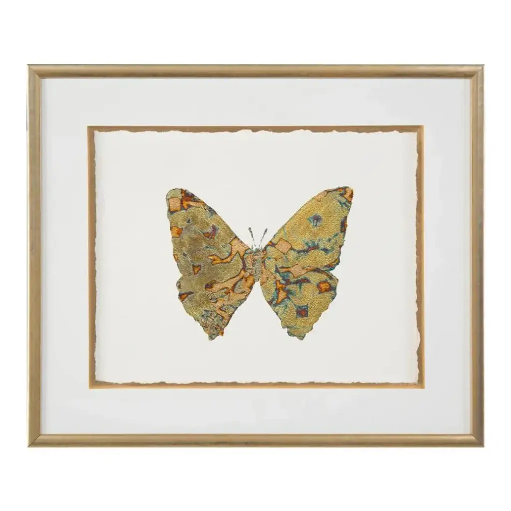 Beautiful Wings by Joy Colangelo is her colorful version of butterflies. These pieces are accented with gold and silver leaf and printed on linen fabric. Framed in a gold hammered frame.