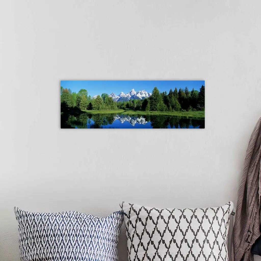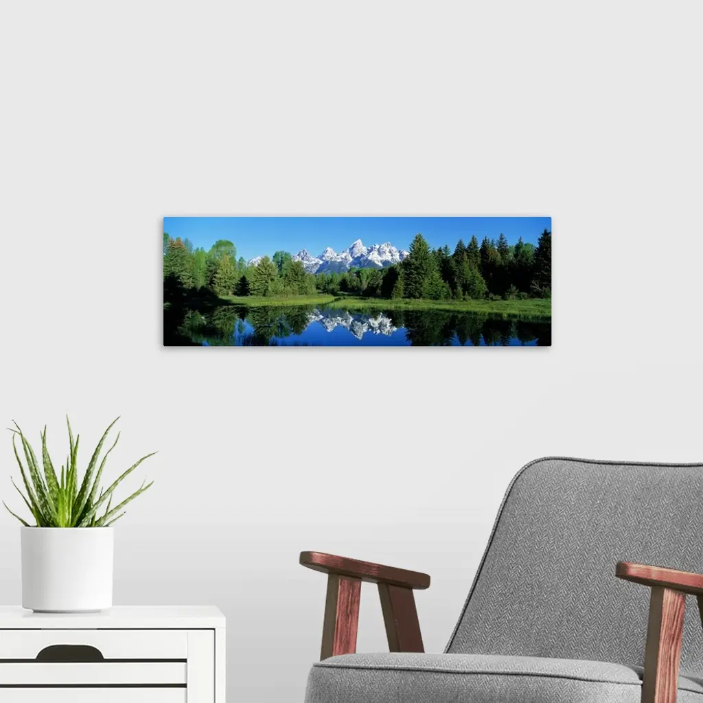 Pointed mountain peaks mirrored in the still waters of the lake below, surrounded by a dense forest of evergreen trees.