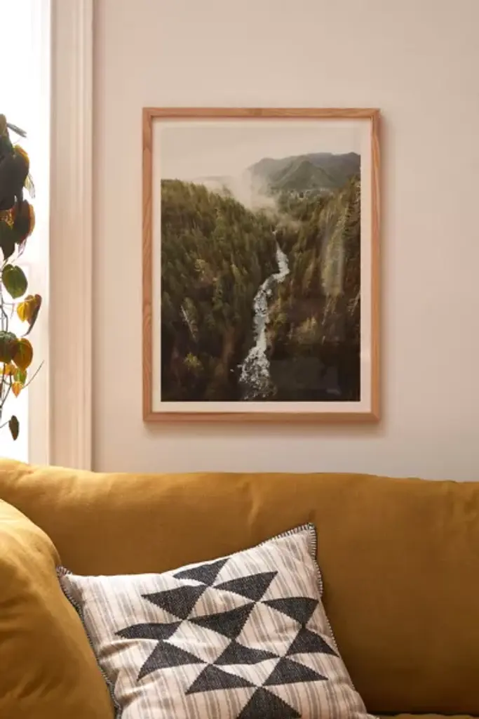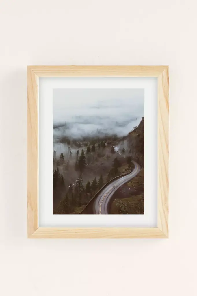 Oregon’s Rowena Crest Viewpoint captured from above as the fog sets in with this art print photographed by Becca Tapert. Printed on archival paper made from cotton pressed in Italian mills, this high-quality art print is available in sizes and frames just right for your space. First select your frame (or go frameless), then select your size. **About the Frames** \- All frames are manufactured in the US \- Matte frames are durable poly \- Wood frames are recycled wood \- All are fitted with protective plexiglass \- Finished with wood moldings, archival backer and protective bumpers **Size** \- Available in multiple sizes \- Use the Size Guides to find the size that fits your space **Content + Care** \- Wipe clean \- Made in the USA