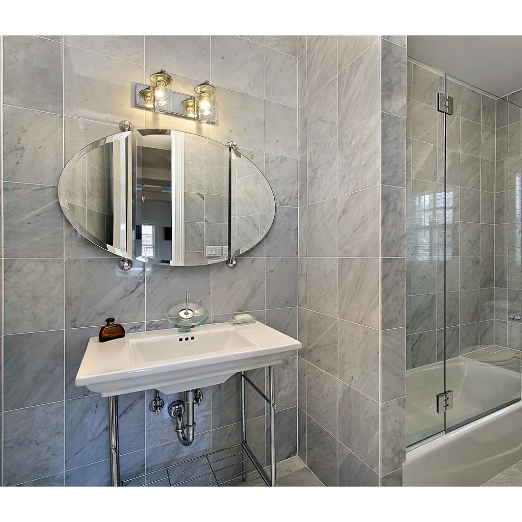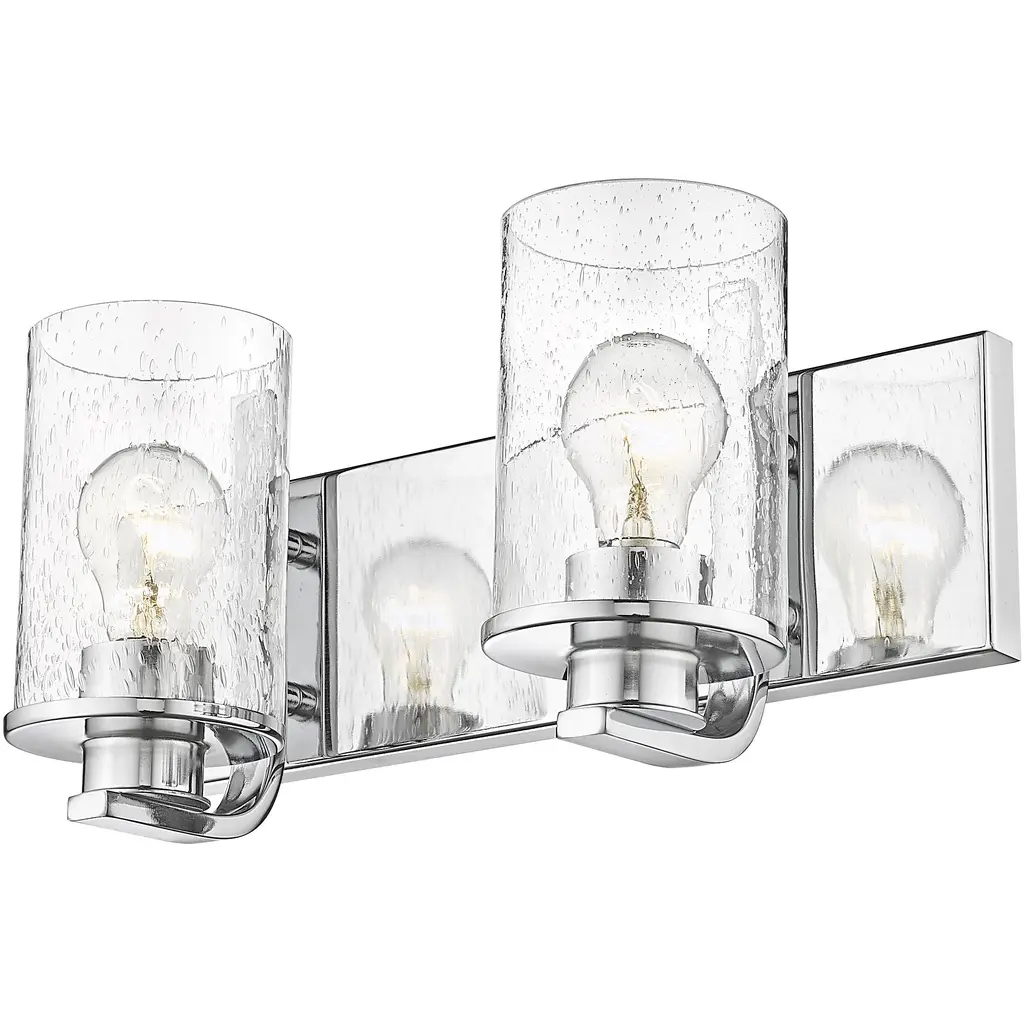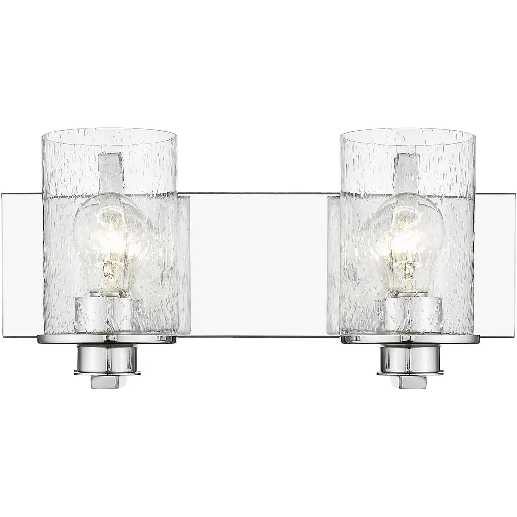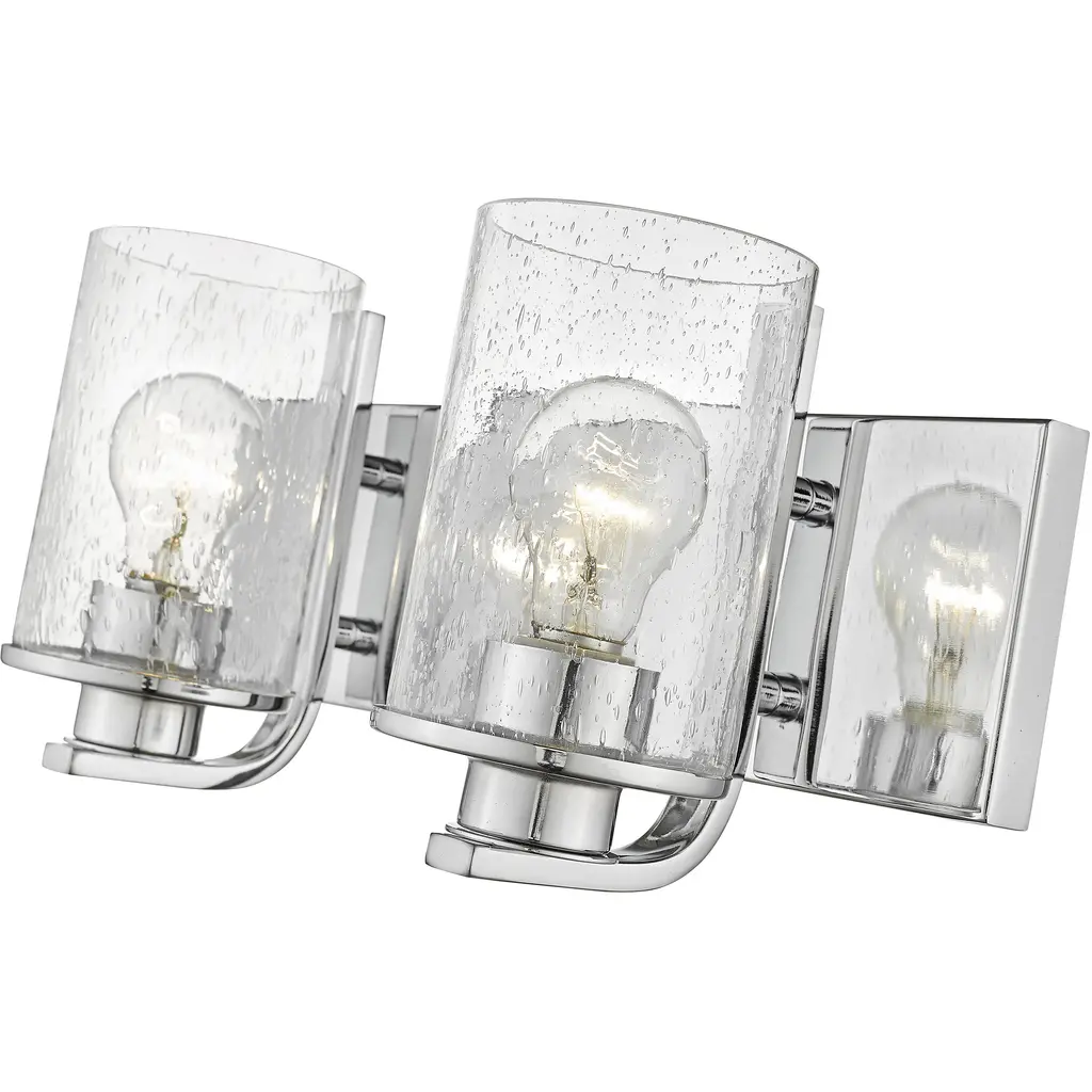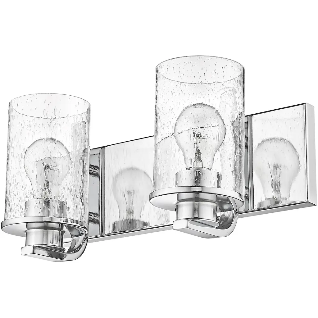 The romantic effect of clear seedy glass adds a custom design element to this contemporary two-light vanity, a great choice for illuminating modern bath and dressing spaces. Glass shades embellish the minimalist yet stylish look of steel frames and mounts made of radiant chrome finish steel. This two-light vanity light from the Beckett collection dresses up a compact bath space with sophistication.