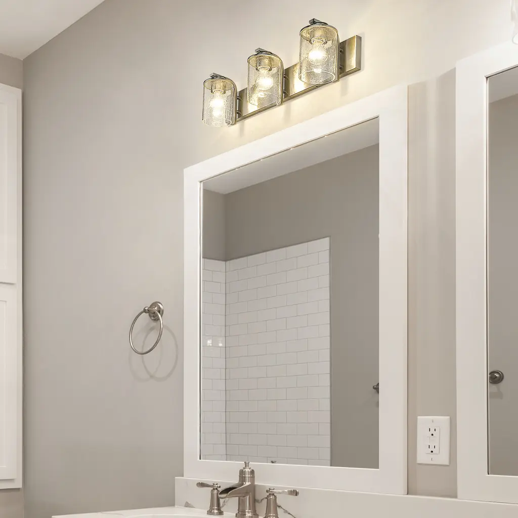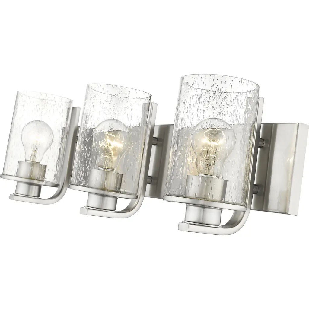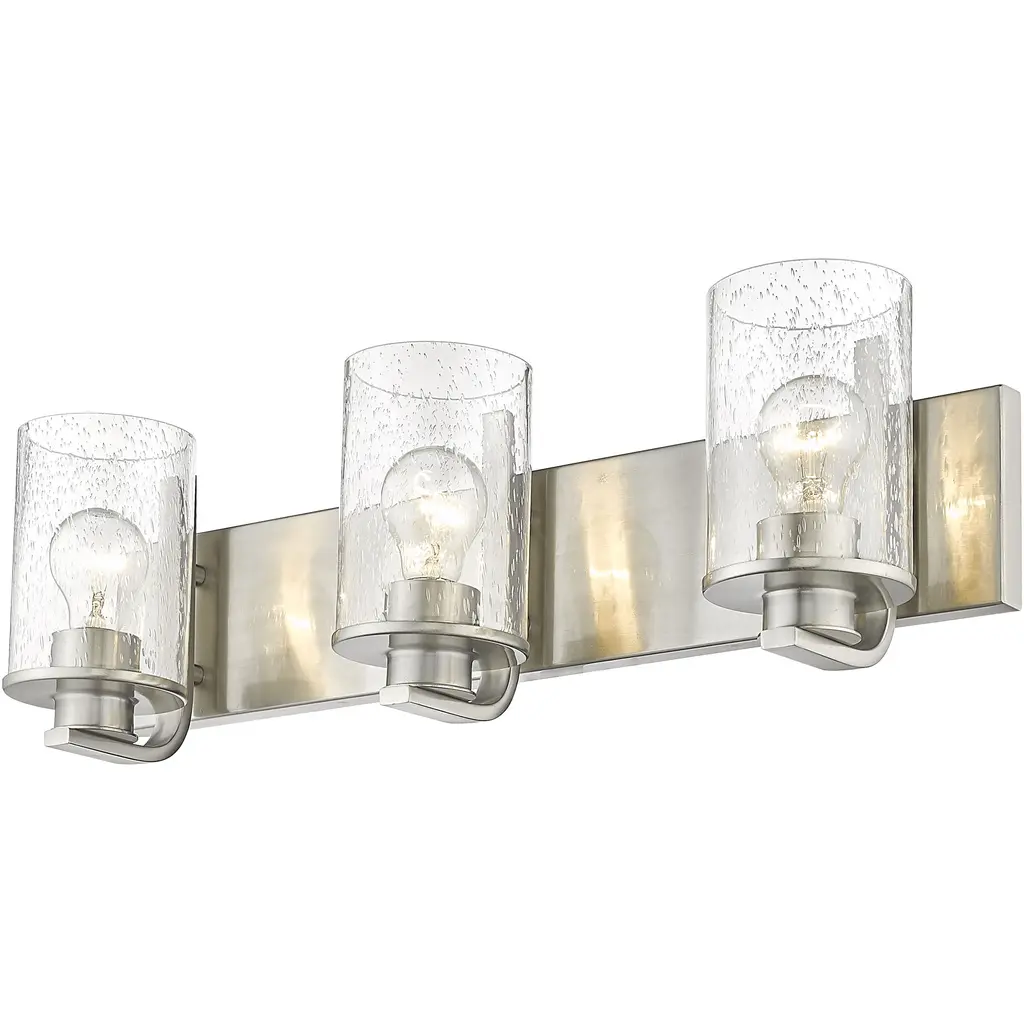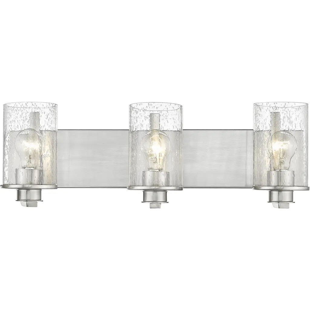 Light up a modern or transitional bath space with this elegant three-light vanity light from the Beckett collection. Showcasing a hint of village nautical fare, its romantic clear seedy glass cylinder shades offer a heady effect. A rectangular steel mount and accents fashioned of classic brushed nickel finish steel deliver a tasteful aesthetic.