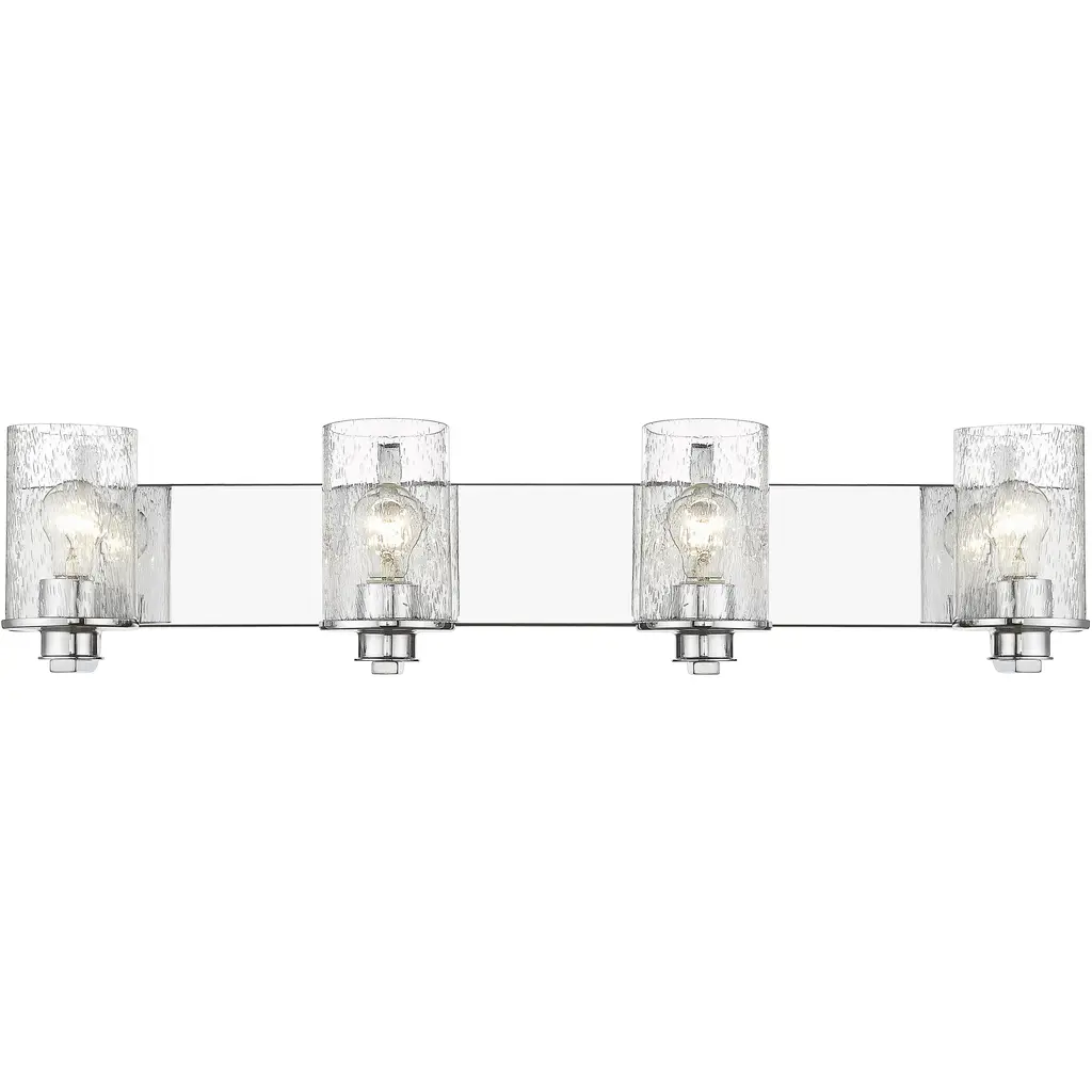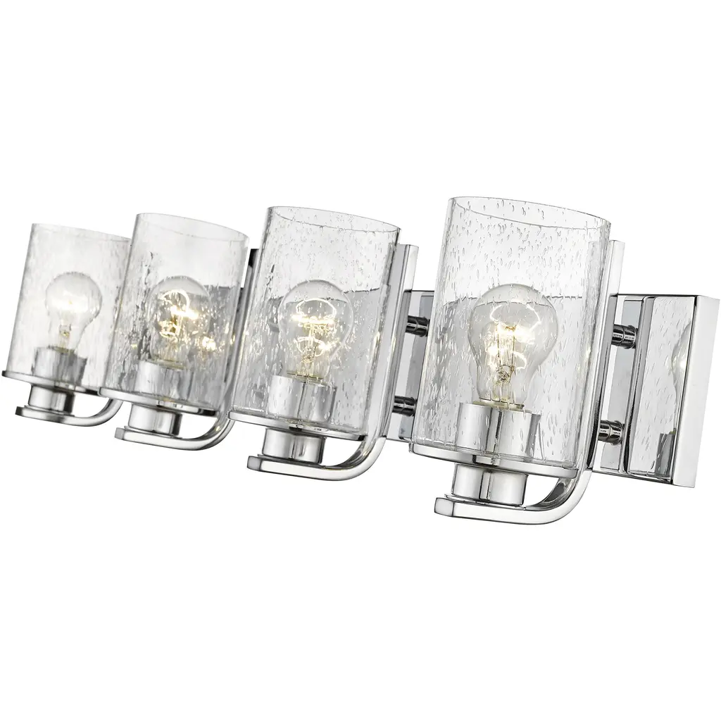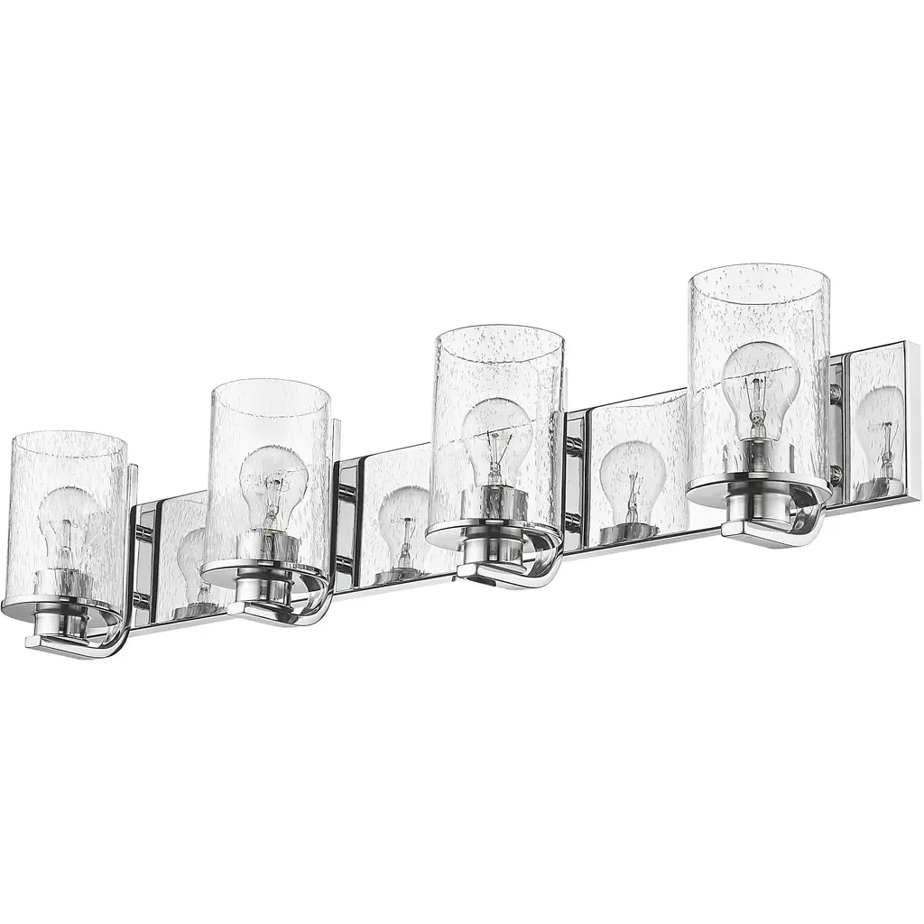 This four-light vanity light from the Beckett collection offers a minimalist look with customized materials. Create a sophisticated aesthetic in a mid-sized bath or dressing space with a fixture formed of bright chrome finish steel and highlighted with the romantic look of cylindrical clear seedy glass shades.