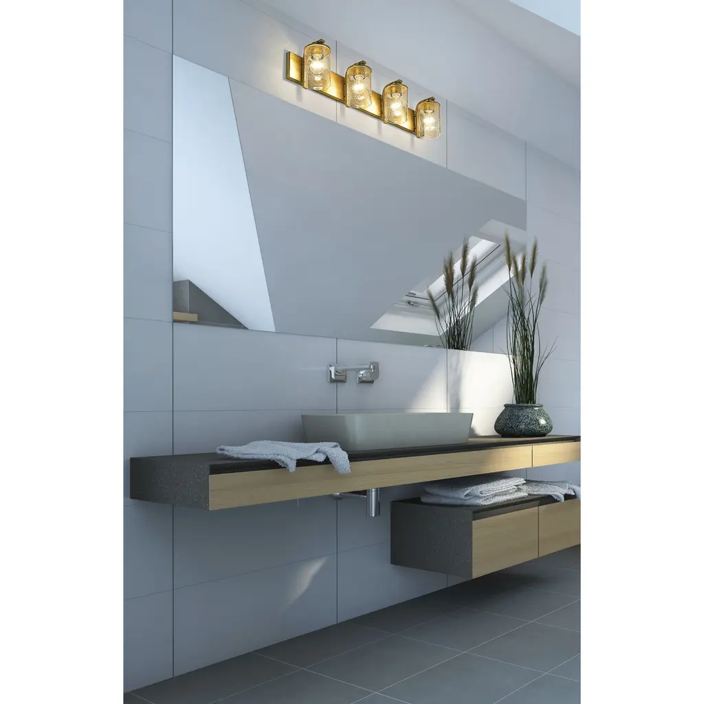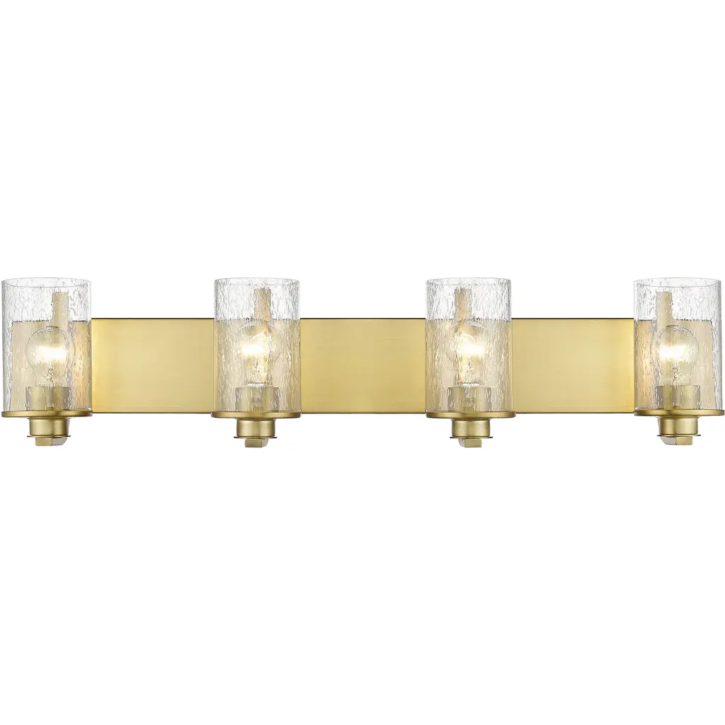 This four-light vanity light from the Beckett collection offers a minimalist look with customized materials. Create a sophisticated aesthetic in a mid-sized bath or dressing space with a fixture formed of warm olde brass finish steel and highlighted with the romantic look of cylindrical clear seedy glass shades.