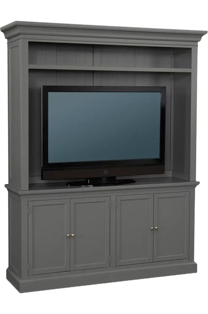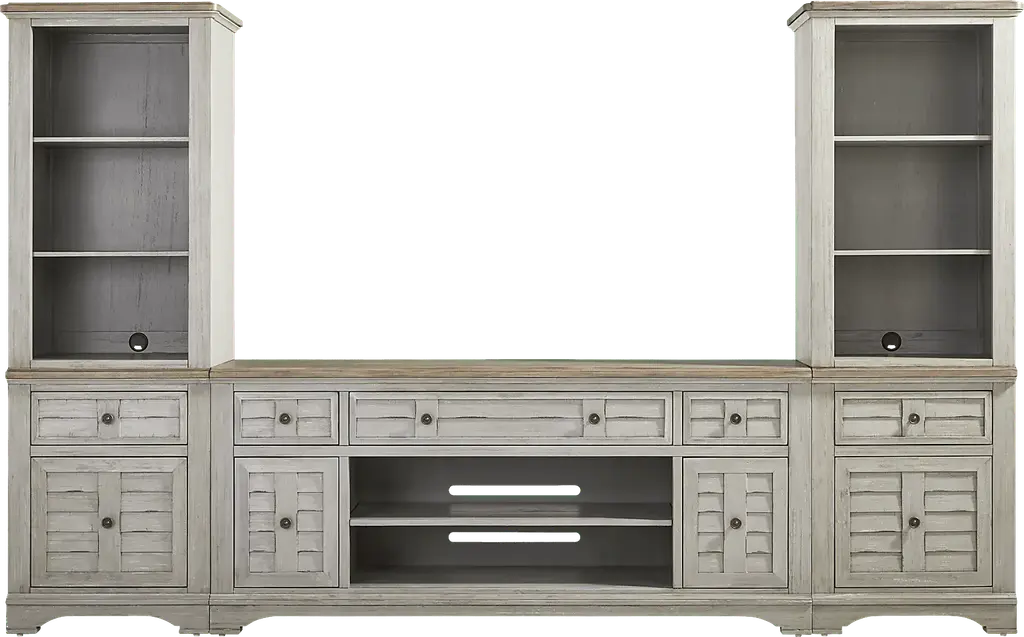 Introduce rustic and handsome appeal into your space with our Beckley entertainment wall. Crafted from pine solids and complete with a dovetail grey finish, this piece features a reclaimed wood appearance and is attractive and well-made. Drawers in the unit's console and piers accommodate media items while adjustable wood-framed glass shelves effectively display decorative or accent pieces. Oil-rubbed bronze knobs and wood knots offer character. Touch lighting in the piers and hutch dims to create an ambient mood.