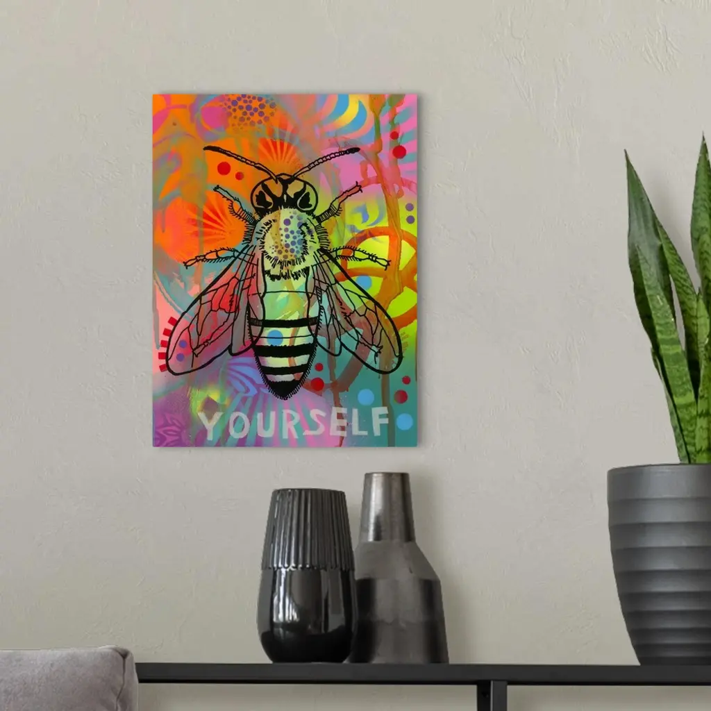 Black illustration of a bee on a colorful graffiti style background with "Yourself" written underneath the bee.