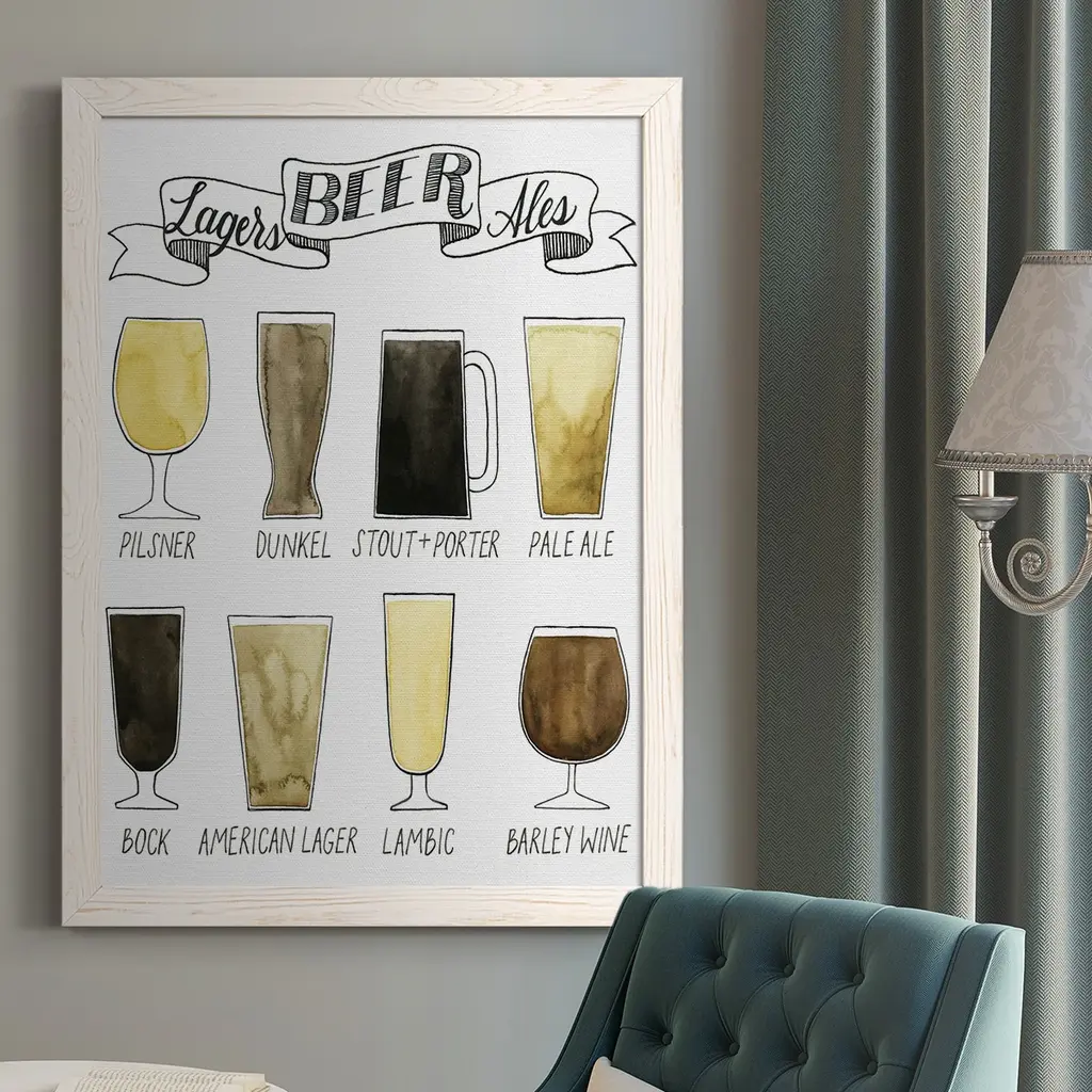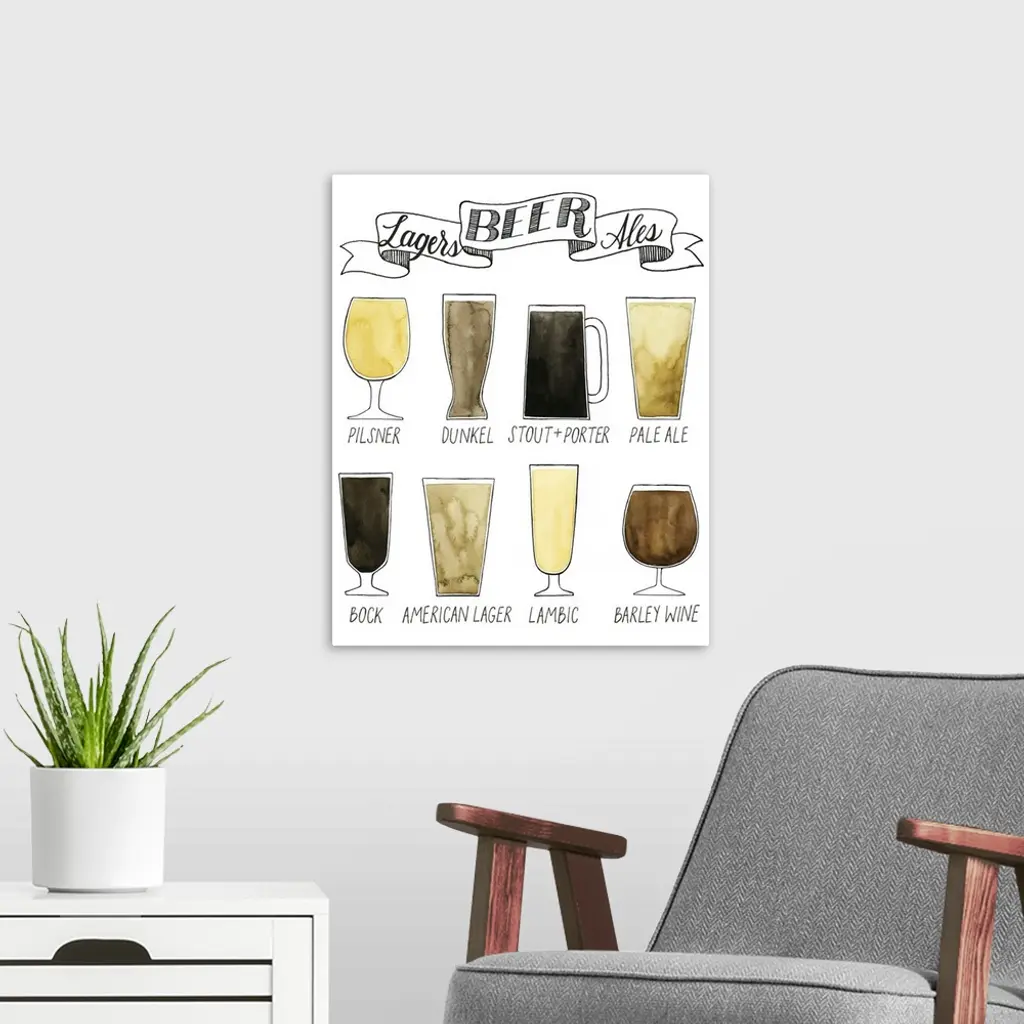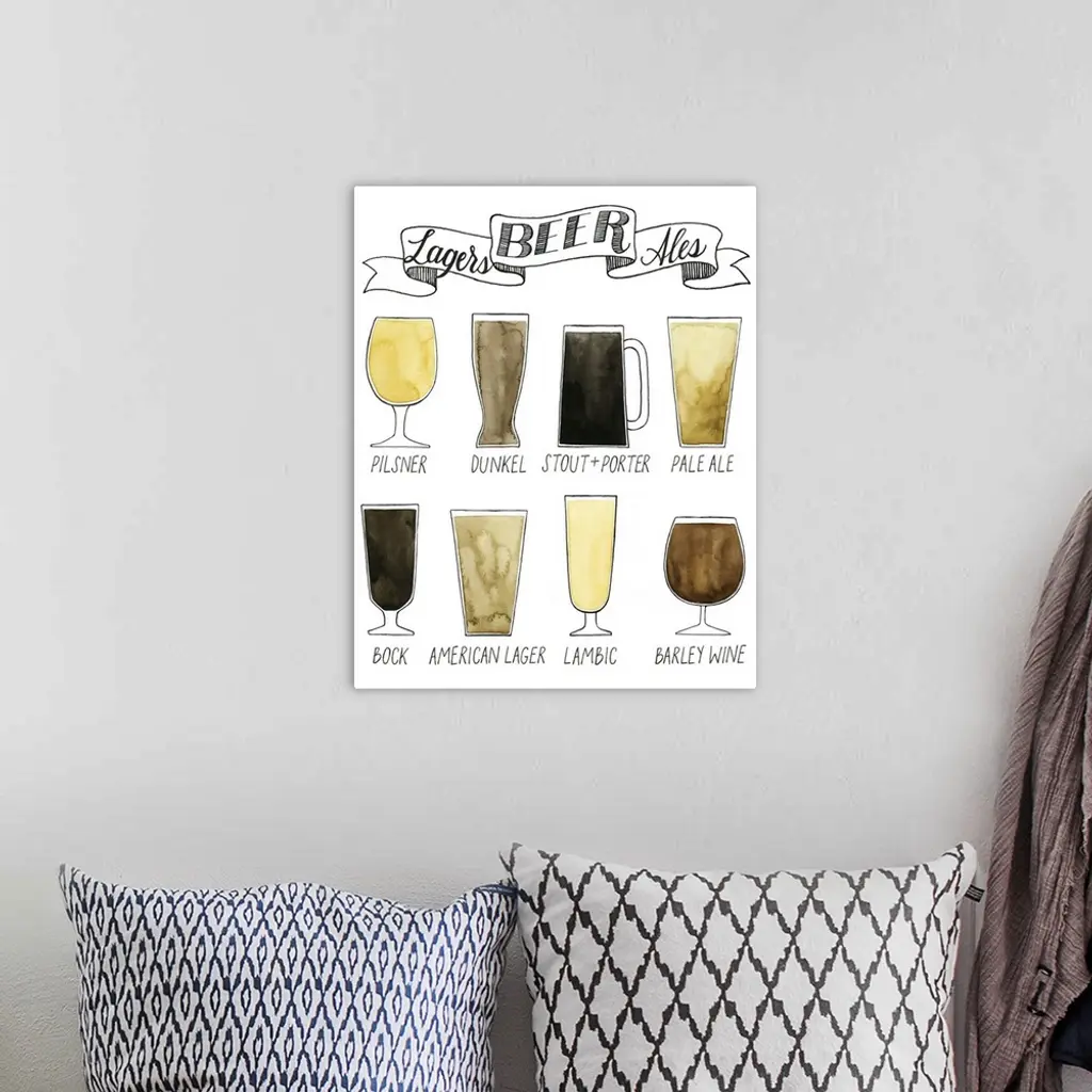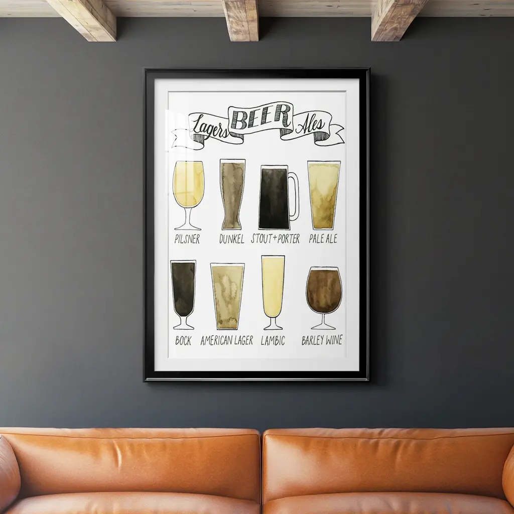 Illustrated beer guide sign with the color and type of glass each type of beer should have.