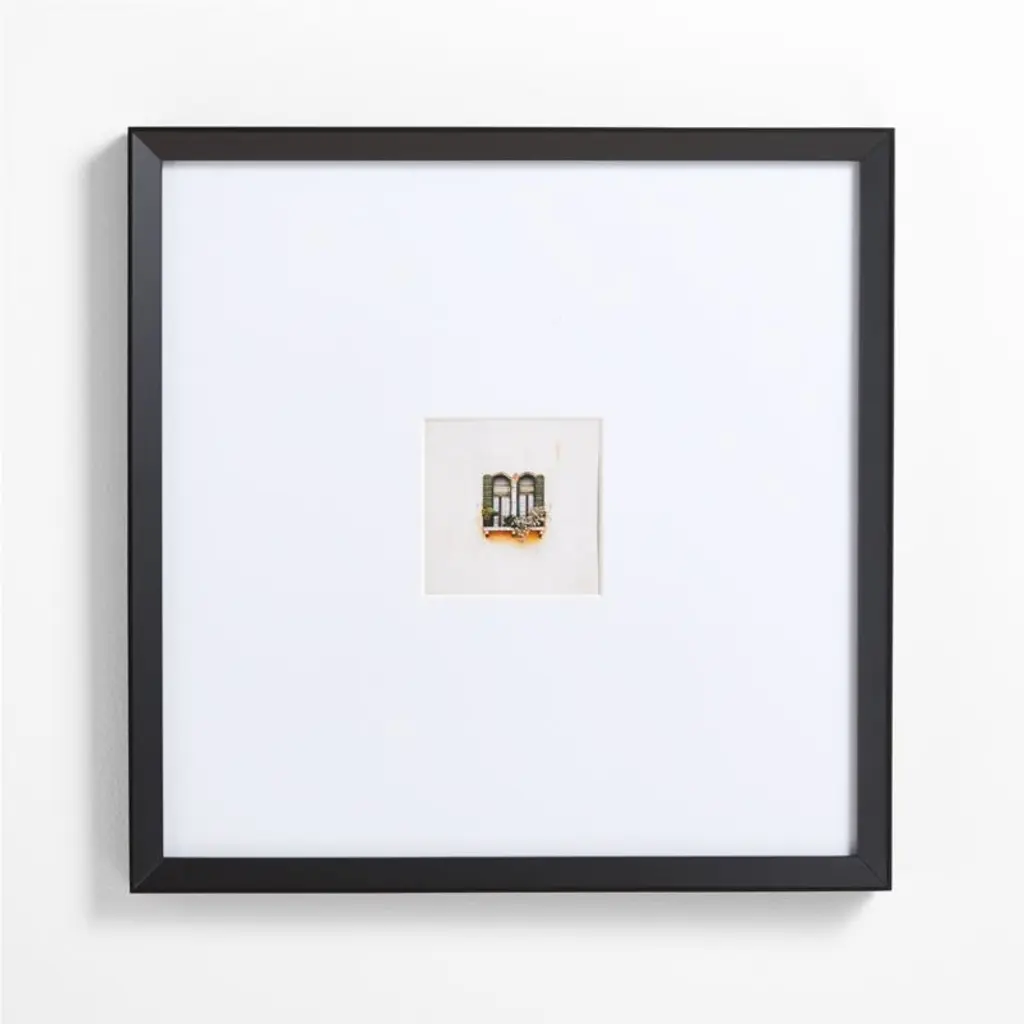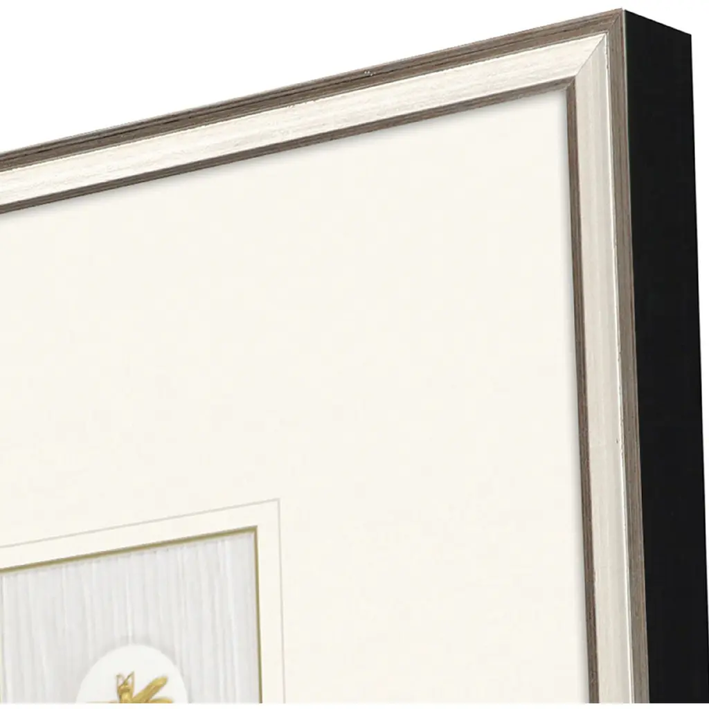 Traditional intaglios feature white off-set matting and are accented with a hand applied decorative paper. Framed in a silver leaf wood shadow box.