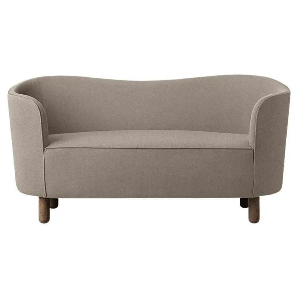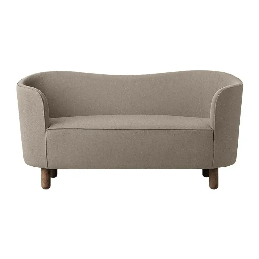 Beige and smoked oak Raf Simons Vidar 3 Mingle sofa by Lassen Dimensions: W 154 x D 68 x H 74 cm Materials: Textile, Oak. The Mingle sofa was designed in 1935 by architect Flemming Lassen (1902-1984) and was presented at The Copenhagen Cabinetmakers’ Guild Competition in the same year. It was subsequently praised for its qualities as a small but elegant sofa in the professional journal “The Architect”. Flemming Lassen loved to travel, and he was often inspired by his journeys throughout Europe. He was very taken with both Italy and France, and had a burning desire to tour those countries on his motorcycle. Flemming Lassen wanted to create a sofa made for conversation with a comfort that invited people to stay seated and talk together for long periods of time. The armrests were designed to encircle the sitters, generating intimacy and transforming the sofa into a cosy place to relax. Flemming Lassen took inspiration from both French elegance and modern Italian style, and transferred the trends and his own ideas to a small, upholstered sofa called Mingle.