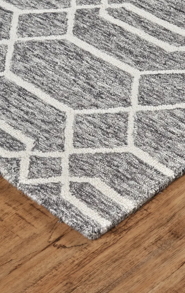 Collection: Belfort Colors: Gray, Black, Ivory Construction: Hand Tufted Material: Face: 100%Wool / Warp: Cotton Pile: Low Pile Pile Height: 0.5" Styles: Transitional,Traditional,Farmhouse Backing: Cotton Made In: India Thickness: 0.5" Price Range: $$$$$ (Most Affordable)
