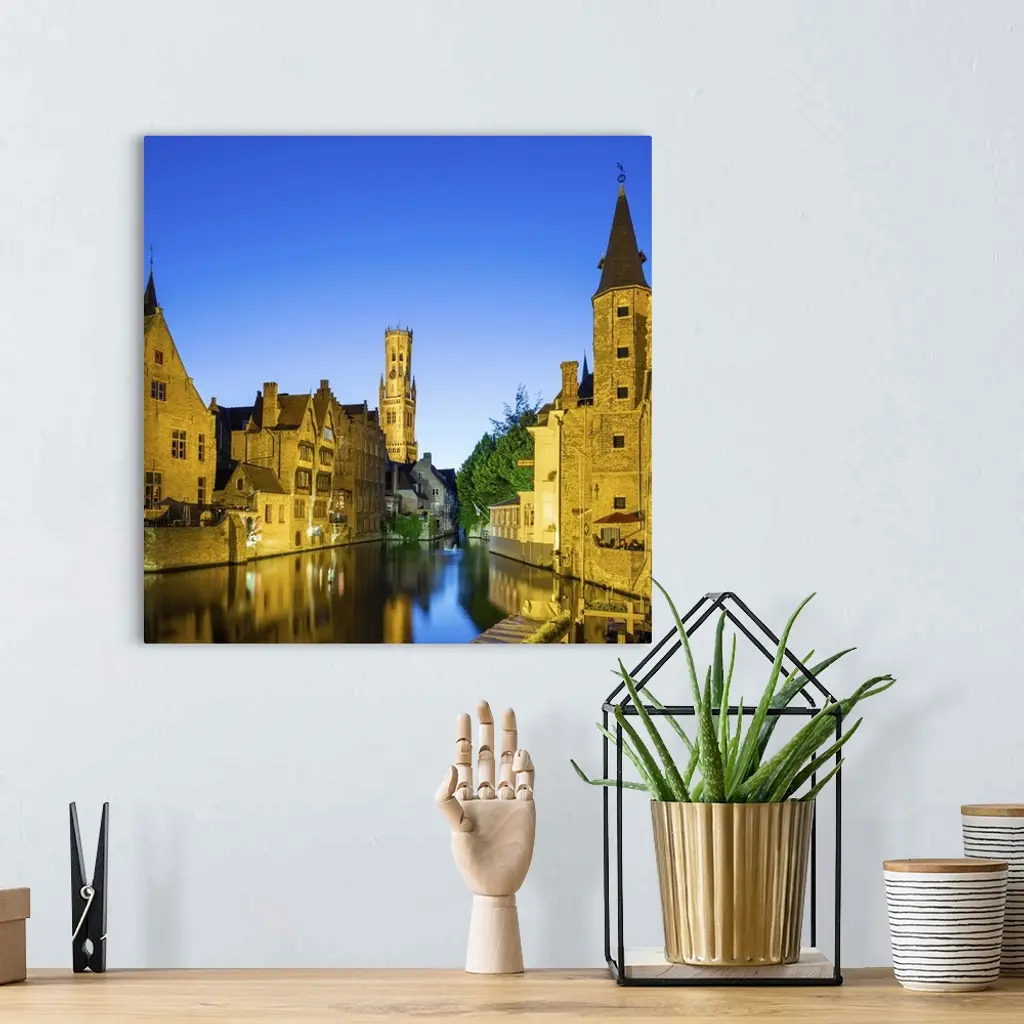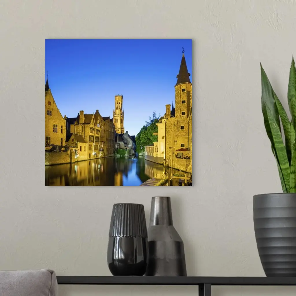 Belfort Van Brugge And Medieval Buildings On The Dijver Canal From Rozenhoedkaai At Dusk